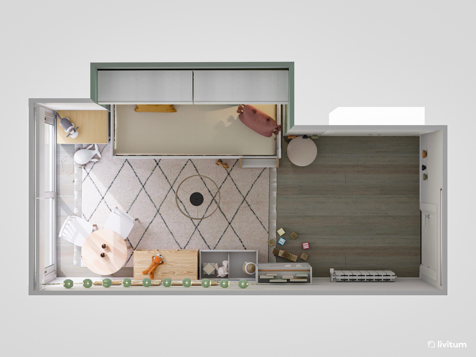La forma alargada de esta habitación no permitía colocar dos camas sin que ocuparan todo el espacio. Así que la solución ha sido colocar una litera en una de las paredes más largas, dejando la otra para tener zona de almacenaje para los juguetes. La pared de la litera también ha sido muy bien aprovechada, ya que sobre ella se han colgado un par de muebles cerrados. La otra pared se ha llenado de baldas y estanterías para albergar todos los libros y juguetes de los más pequeños. Algunas de ellas están situadas a una altura baja para que los niños puedan acceder a ellas con más facilidad. En esta zona también se ha añadido una mesa y un par de sillas de su tamaño. Acaban de conformar la decoración, una alfombra para que los niños puedan jugar a sus anchas sin preocuparse del frío, y varias láminas decorativas de divertidos dibujos y alegres colores.