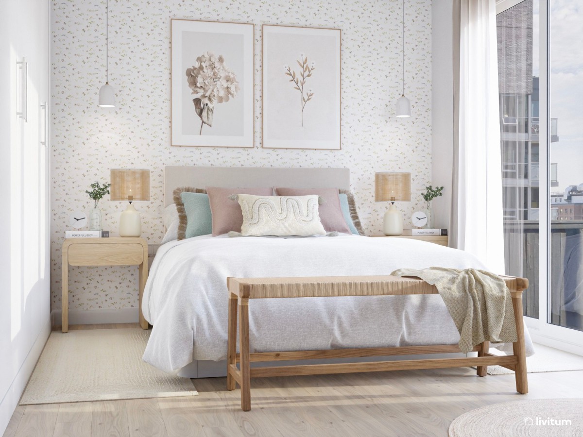 Al igual que en otras estancias de la casa, el papel pintado reinará en los dormitorios de todos los tamaños. Este recurso decorativo es ideal si queremos generar un ambiente envolvente con texturas que parecen tejidos o con suaves relieves. En una habitación, podemos integrar el papel pintado en la pared del cabecero, logrando un efecto nido muy acogedor y relajante.