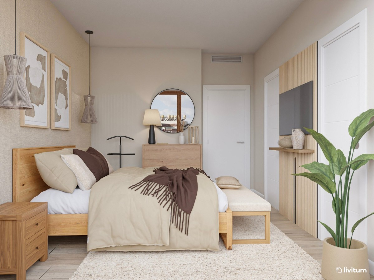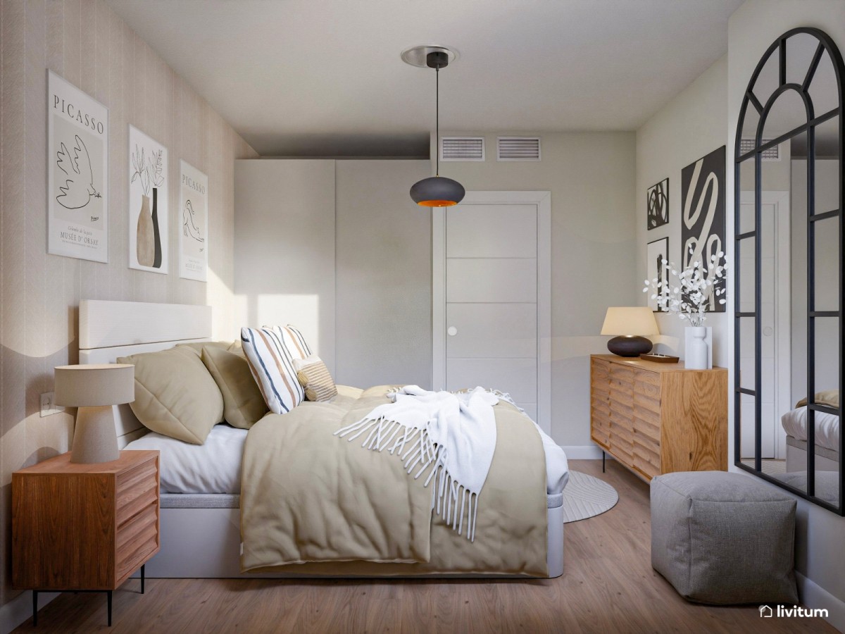 En 2026 dejamos atrás la simetría perfecta. No sería nada raro ver habitaciones con mesitas de noche distintas, siempre que compartan algo. Por ejemplo, altura similar, una misma familia de materiales o una proporción compatible. En dormitorios dobles pequeños, esta idea tiene una ventaja: permite adaptar cada lado a las necesidades de cada persona. Quizá un lado necesita cajones para organizar objetos personales y el otro puede ser una balda ligera por falta de espacio en el suelo.