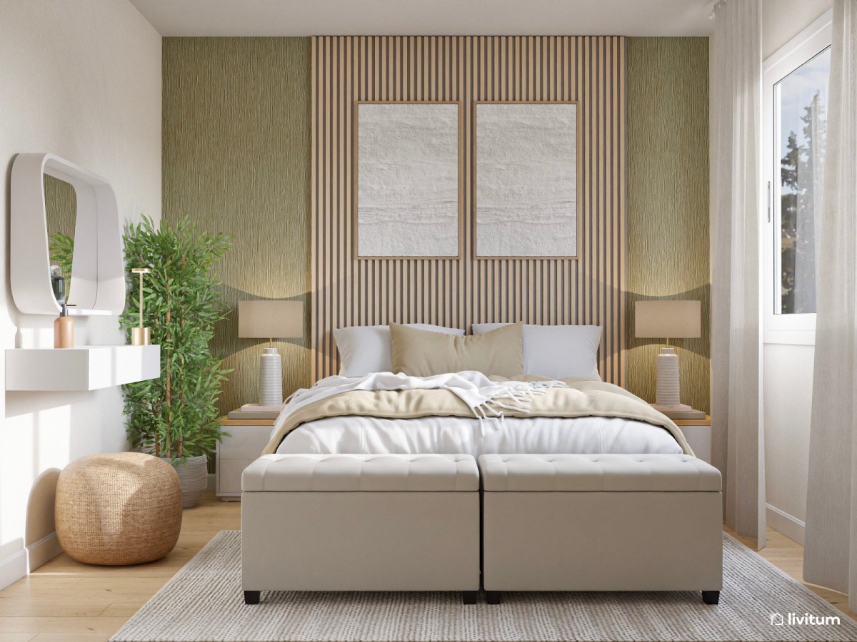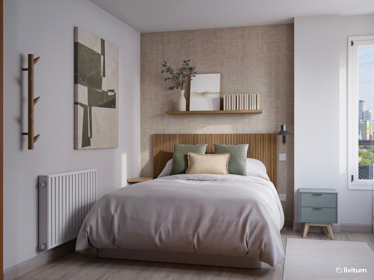 Se acabaron las paredes sosas y aburridas. En 2026 entran con fuerza los revestimientos con relieve. Veremos paneles, listones de madera, imitación de azulejos y papeles pintados. En un dormitorio pequeño, elementos como el relieve, el color y los patrones geométricos pueden ser perfectos para añadir color y profundidad visual sin necesidad de ocupar espacio en el suelo.