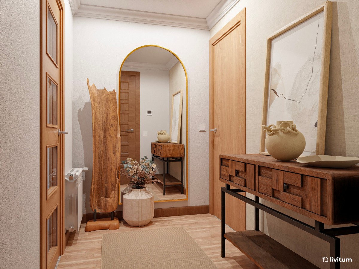 4. Al tratarse de espacios estrechos y largos, es bueno desviar la vista hacia un punto focal que se lleve todas las miradas. Mira la opción de este recibidor. Se ha colocado una obra de arte de tamaño XXL al fondo del recibidor, que decora y hace olvidar la estrechez del espacio. Además, se le ha añadido una preciosa consola de madera estrecha y un par de espejos que ayudan a ampliar el espacio.