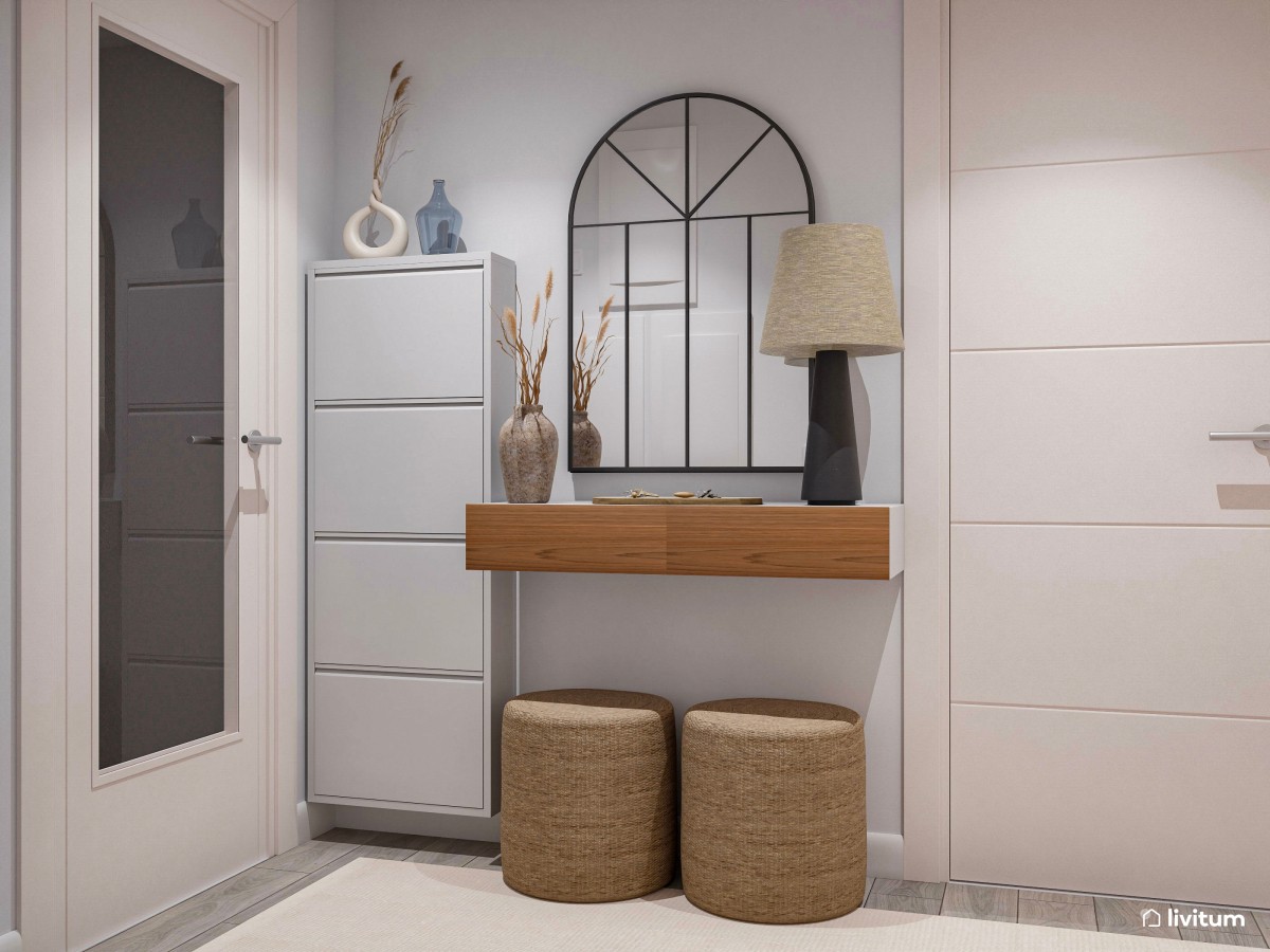 8. Si la pared de la entrada no es muy amplia, aprovecha su verticalidad con elementos como una consola y un zapatero colgado, que liberan el espacio del suelo y permiten colocar otros objetos en él, como un par de puffs, y ampliar visualmente el espacio. Algo que puedes potenciar también con un espejo.