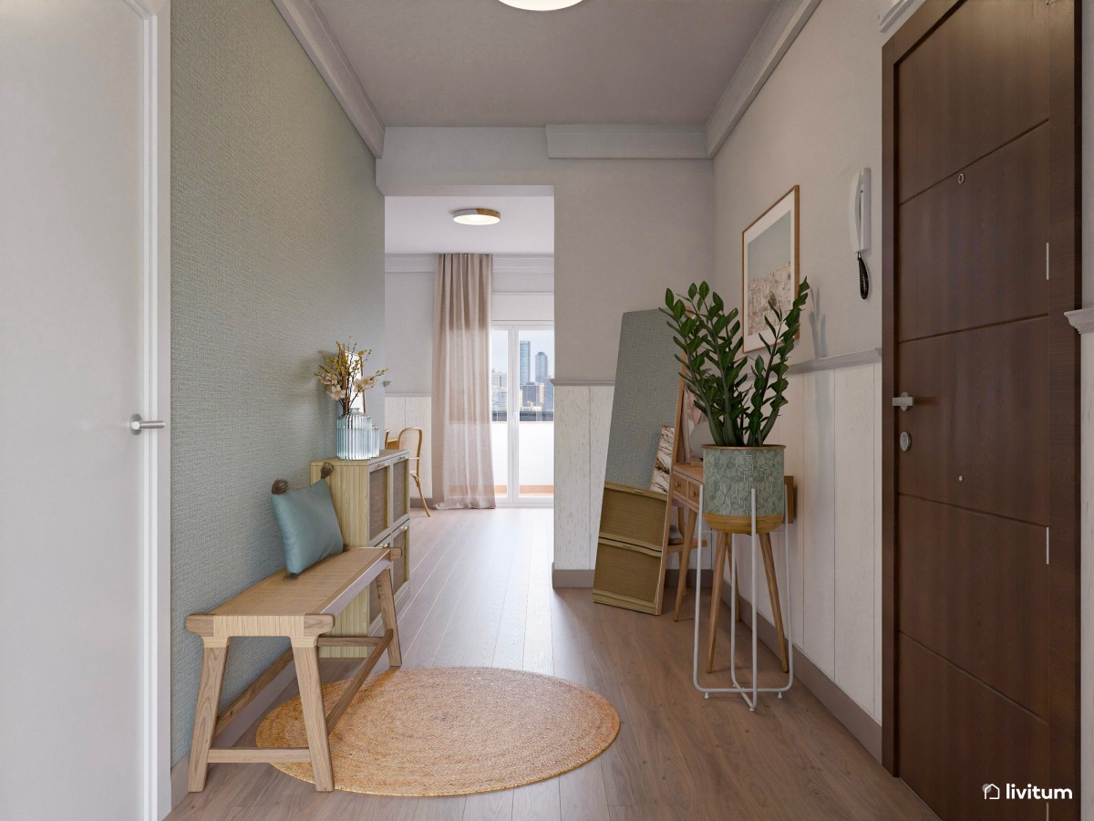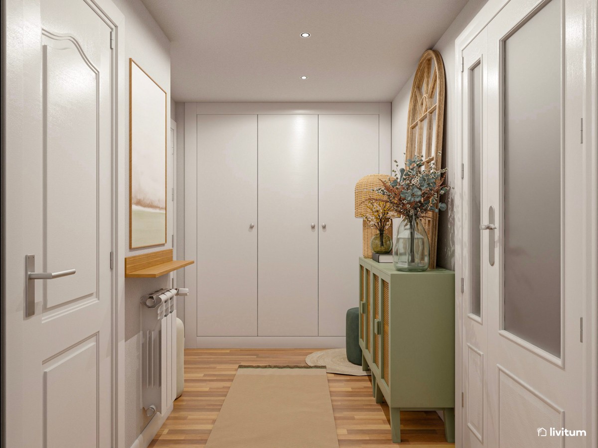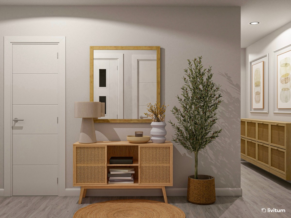 6. También es bueno que las zonas estén bien definidas. Que quede espacio en la entrada, que sea funcional con algo de almacenaje y se pueda circular fácilmente por el espacio, sin elementos de por medio. Si el recibidor desemboca en un pasillo, es bueno que la decoración de ambos espacios sea cohesionada y coherente, usando, como en este caso, muebles parecidos con el frente de ratán.