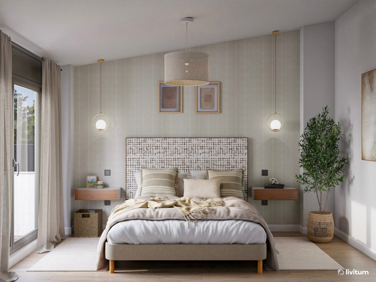 Otra forma sencilla de decorar las paredes es recurrir al papel pintado, disponible en infinidad de diseños. Si quieres un toque moderno, elige un papel texturizado en un color neutro o con dibujos a rayas. Y si quieres algo todavía más original, prueba con textiles en la pared: un tapiz artesanal, una pequeña alfombra decorativa o un adorno de macramé.