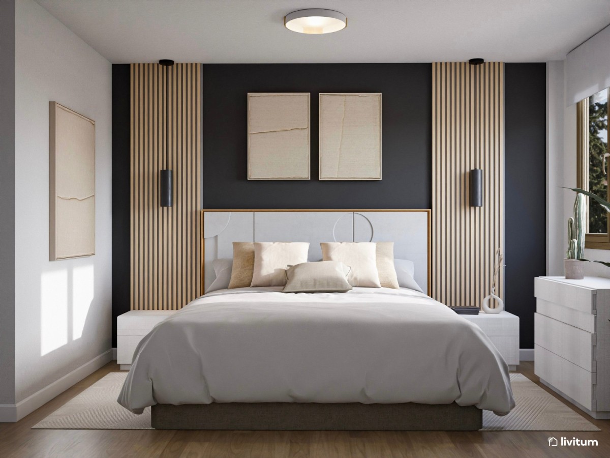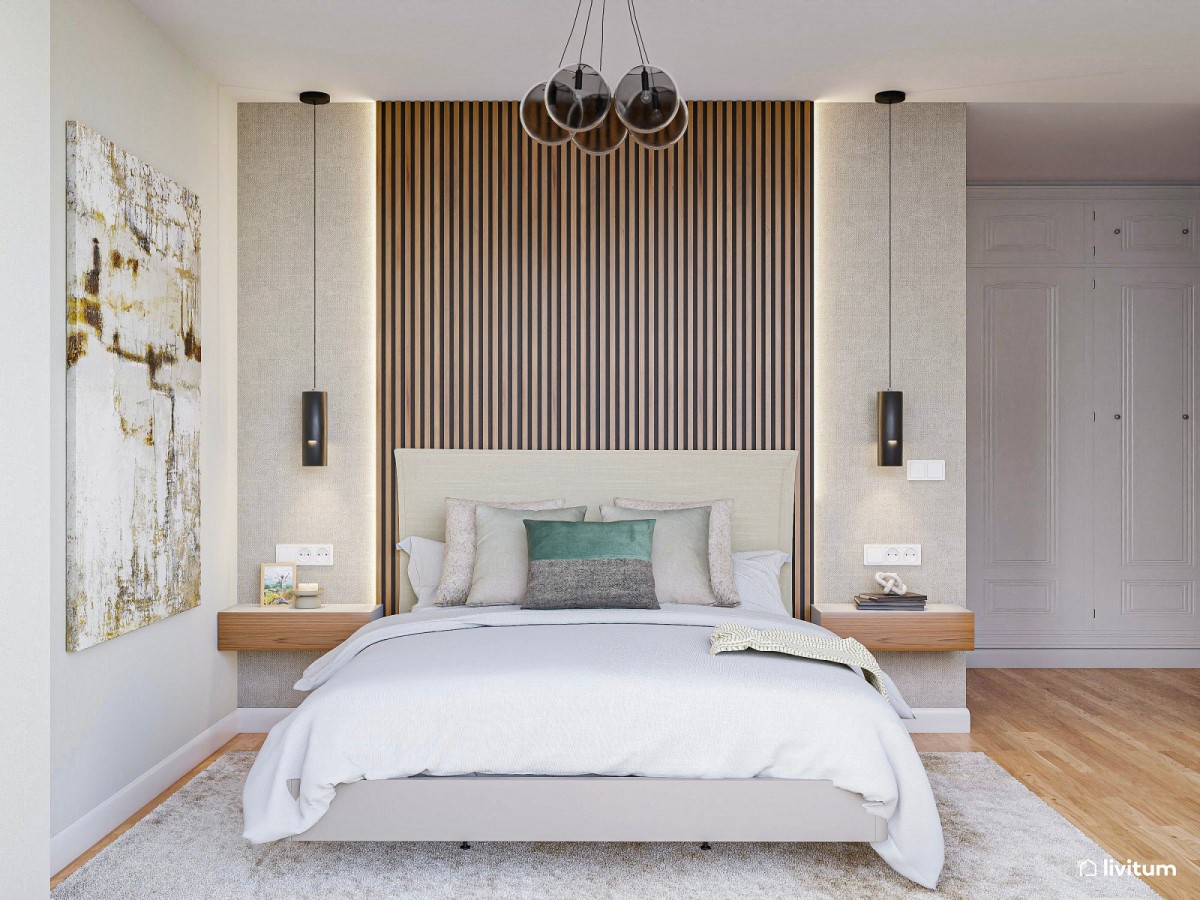 Además de estas propuestas estándares, que pueden servir de base para no equivocarse, después entran otras consideraciones estéticas. Uno puede buscar un efecto con mucho carácter y personalidad para su dormitorio, optando por un cabecero que vaya de suelo a techo, por ejemplo. O prescindir totalmente de él porque ha colgado una gran obra de arte que lo sustituye. O ha enmarcado la zona de la cama con unos listones de madera en los laterales, en la zona de las mesillas de noche.