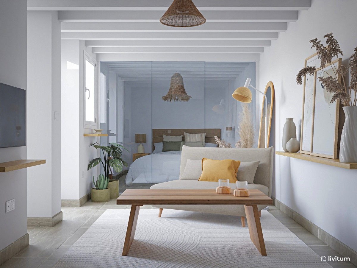Para evitar que la vivienda resulte demasiado fría e impersonal, no olvides añadir algunos detalles que le aporten algo de carácter y personalidad. Lo más sencillo es a través de los textiles, como cortinas, alfombras o cojines, que aporten una mayor sensación de confort. Preferiblemente de tejidos naturales que permitan una mejor y más sencilla limpieza.