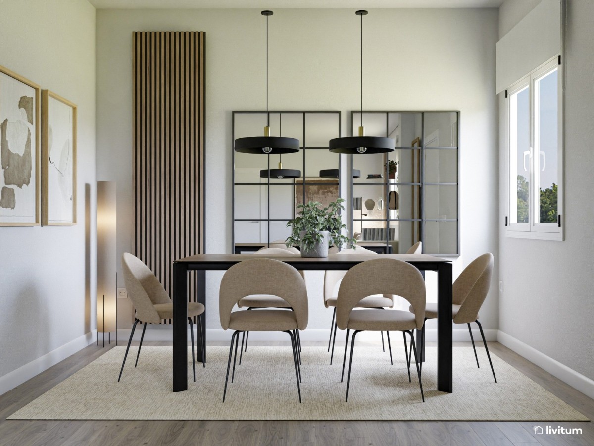 En el caso de tener el comedor integrado en el salón también debes tener en cuenta algunas medidas. Sobre todo en lo relacionado con las sillas. Desde la distancia entre ellas hasta el espacio necesario tras ellas para poder sentarse con facilidad.