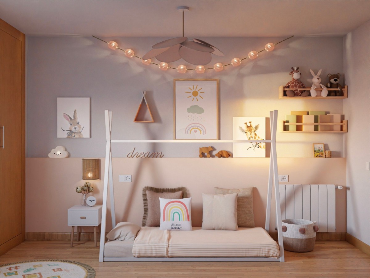 Un dormitorio infantil funciona con cuatro capas de luz: general, ambiental, de tarea y de orientación nocturna. La luz general, en primer lugar, es clave para la vida cotidiana. Permite vestirse, jugar y ordenar todos los objetos de los niños. Conviene que sea homogénea, sin destellos ni conos duros. Un plafón amplio con difusor opal puede ser una buena idea, ya que reparte la luz con suavidad.
