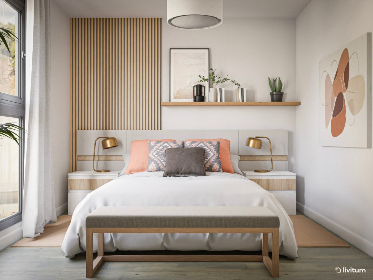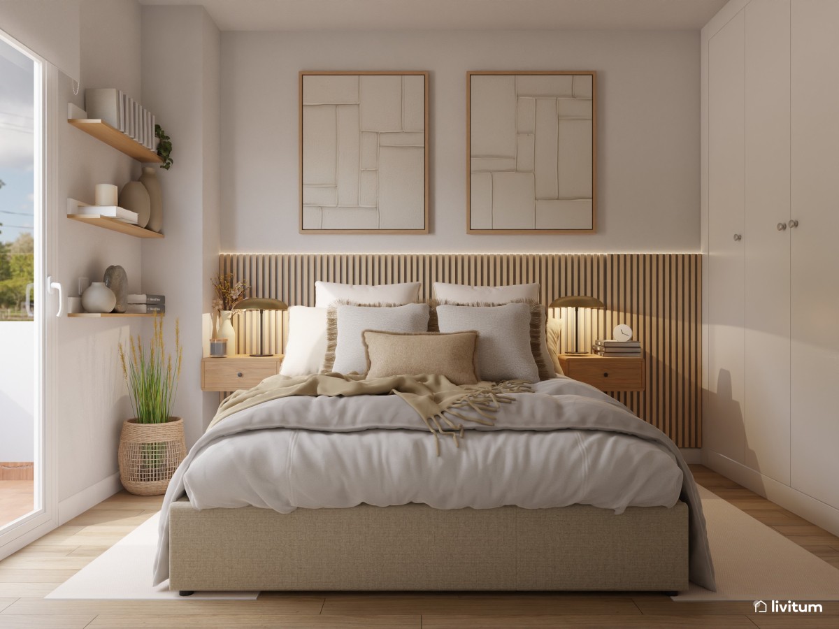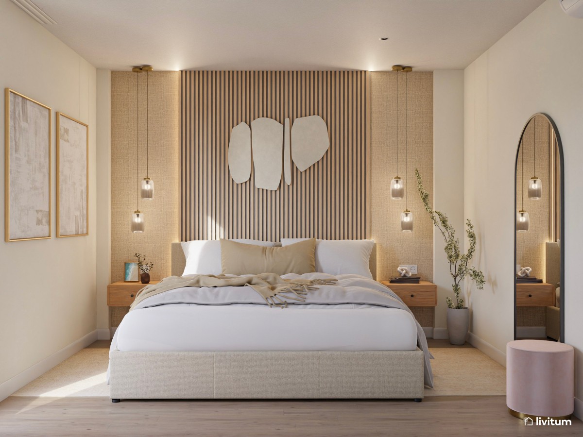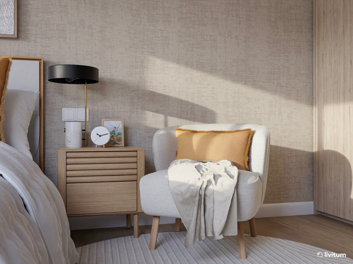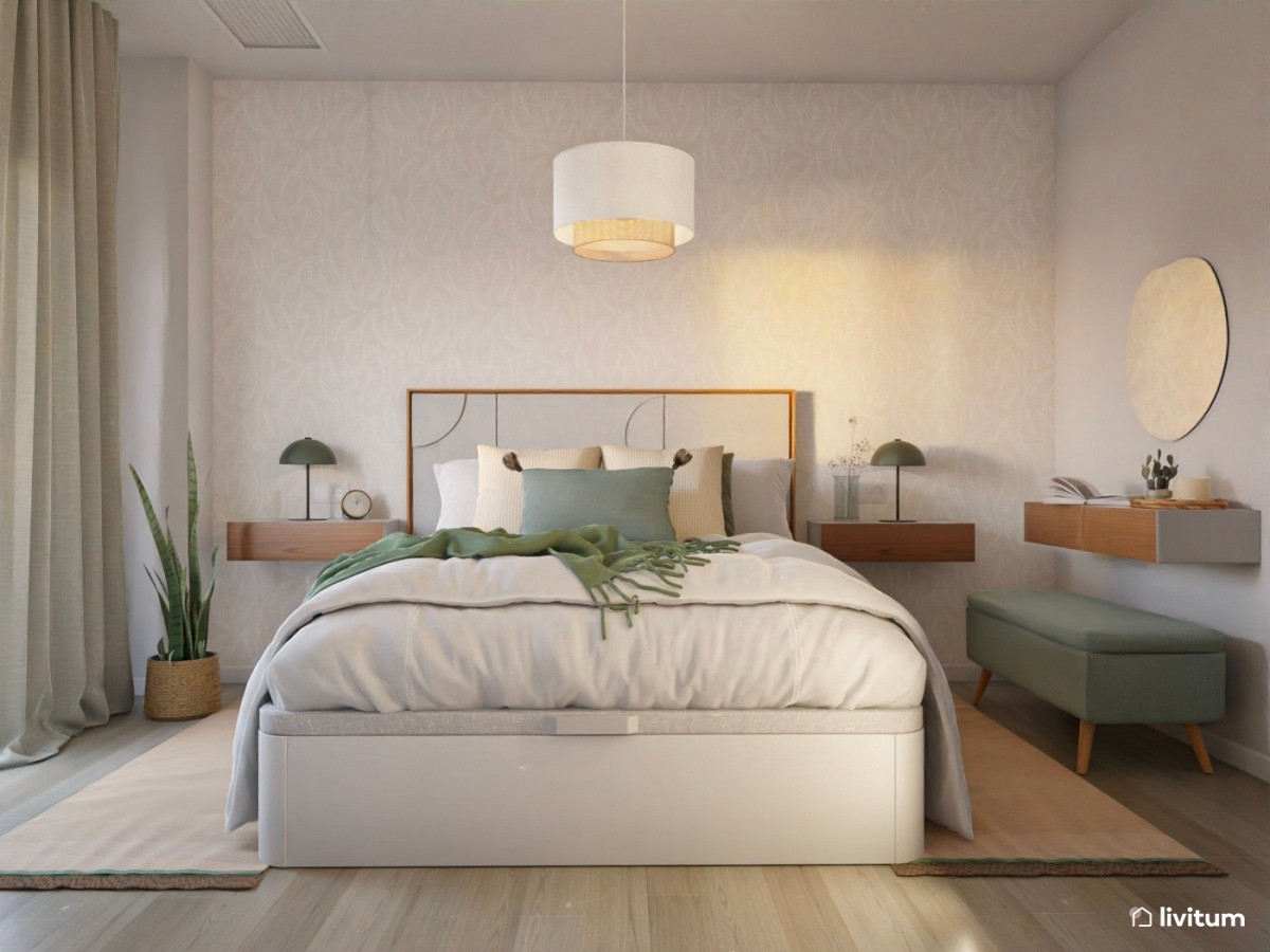 Otra opción es, si cuentas con suficiente espacio, añadir una lámpara de pie con pantalla, que aporte calidez sin deslumbrar, en algún rincón del dormitorio. Procura que esté alejada de la zona de descanso, para conseguir ese ambiente íntimo que quieres.