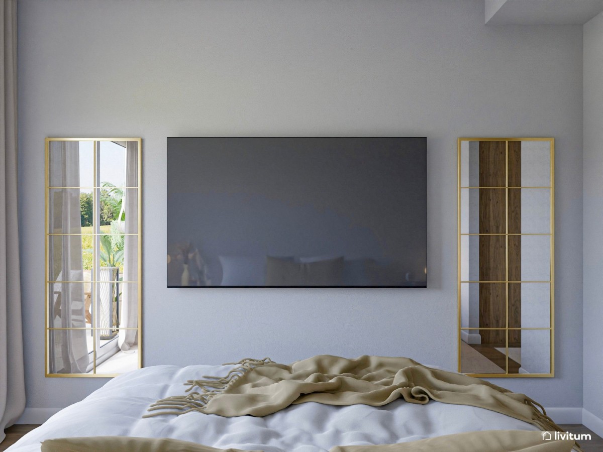 La segunda propuesta resulta más chic y elegante, gracias a la incorporación de unas bonitas molduras en la pared del cabecero, que enmarcan tanto la zona de las mesillas de noche como la de la cama.