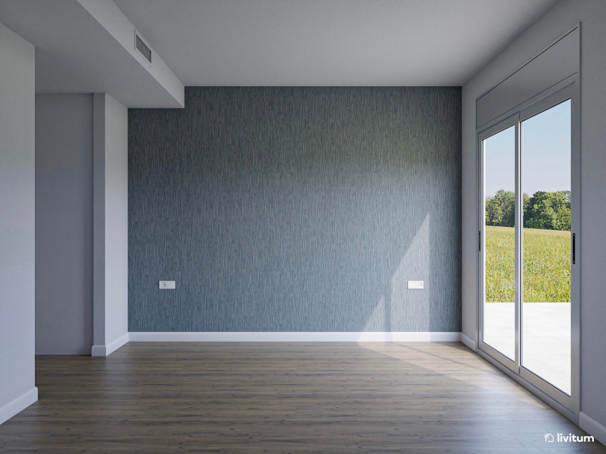 Uno de los colores que más calma transmite es el azul, ideal para incorporar en un dormitorio. Así que en esta propuesta de Laura Álvarez, el azul toma el protagonismo. Lo hace a través de un bonito papel pintado con textura que cubre toda la pared del cabecero, y se repite en algunos cojines situados sobre la cama, cohesionando así la propuesta.