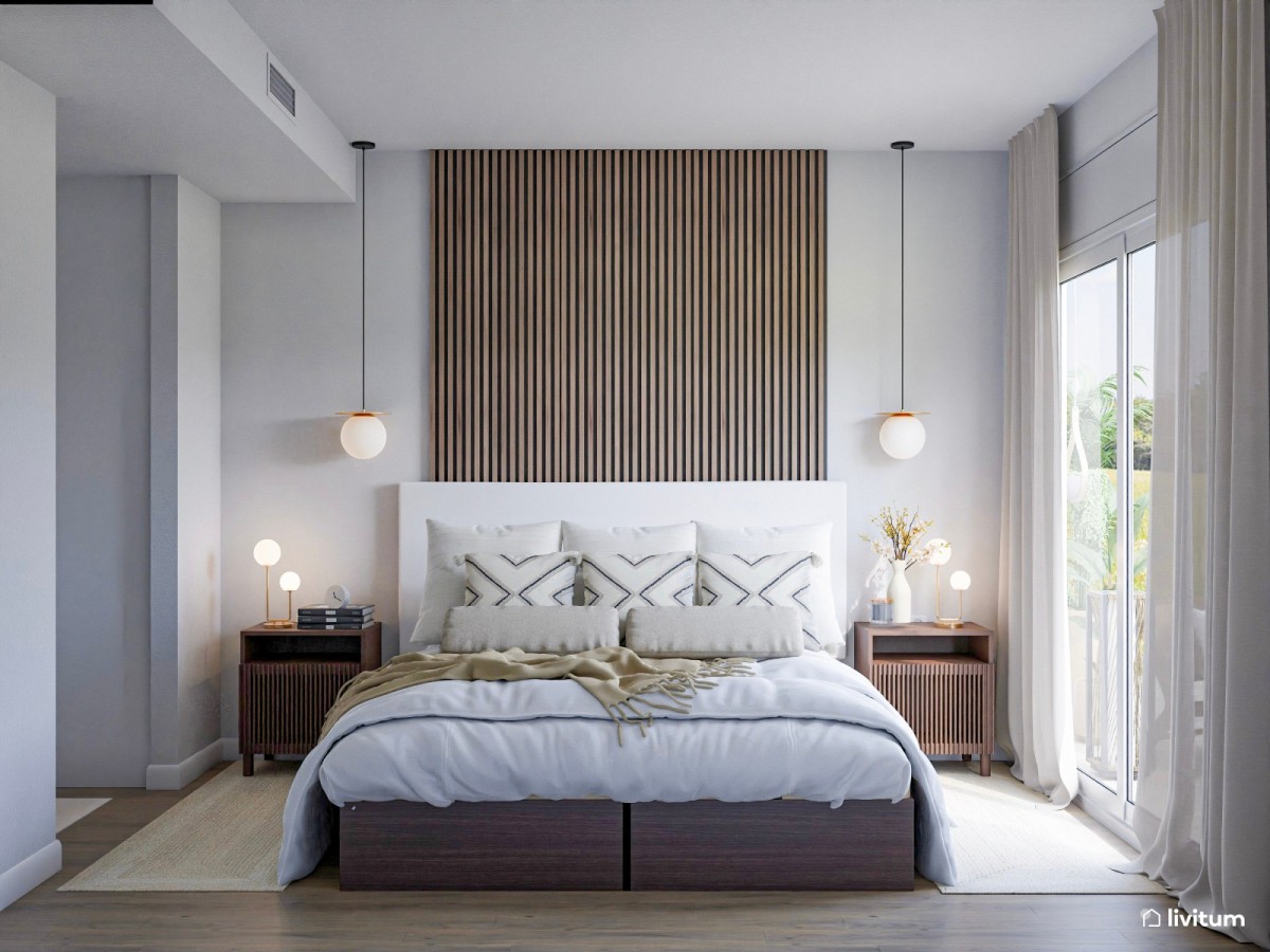Y, ¿qué me dices de esta propuesta más moderna, en la que la madera es la protagonista? Aquí las estrellas del diseño son unos listones de madera, situados de suelo a techo solo en la zona de la cama, convirtiéndose en un impresionante cabecero improvisado, a pesar de contar con otro más discreto en blanco frente a ellos. Una propuesta que enamora a todo aquel que entra en este dormitorio.