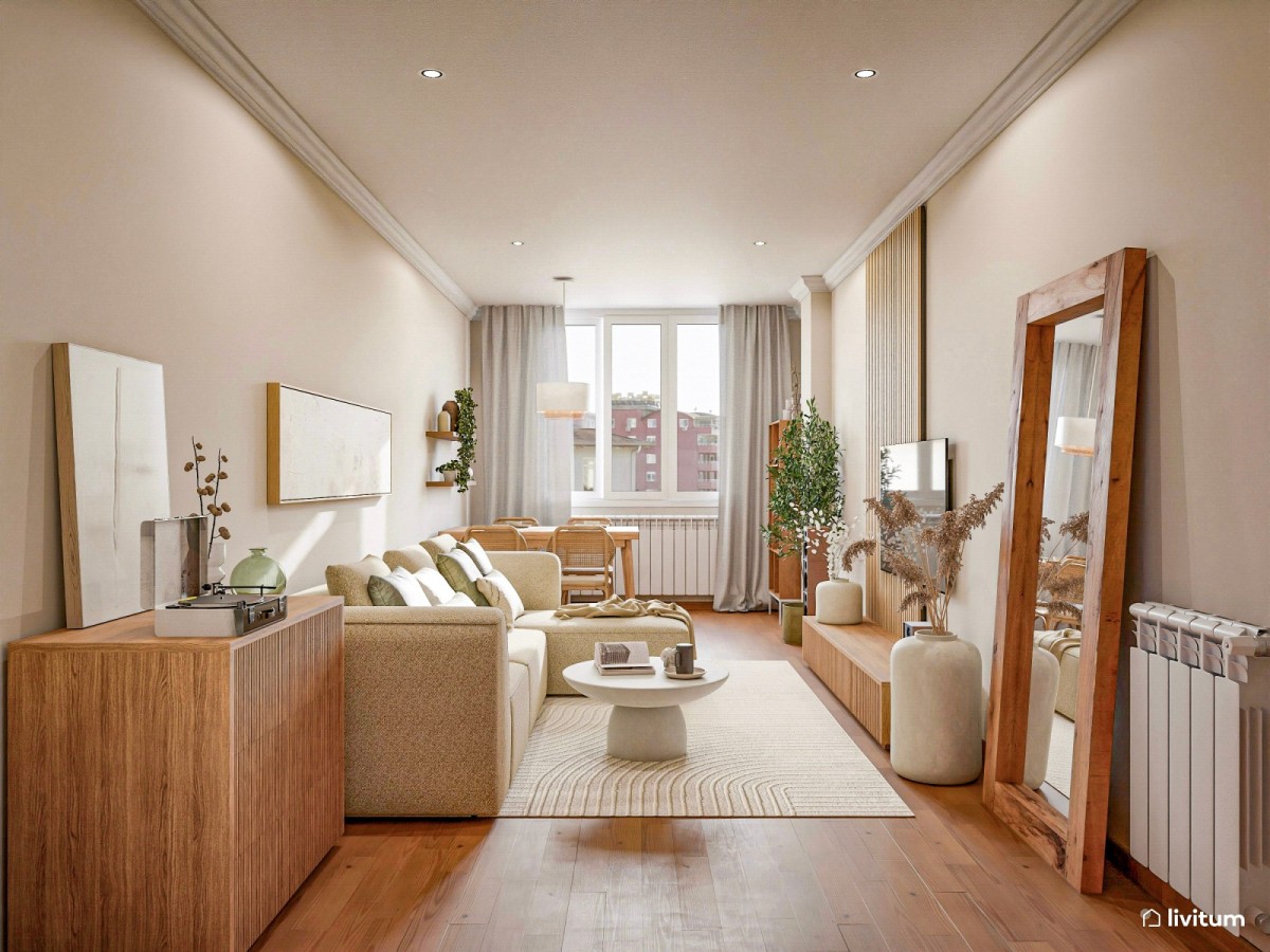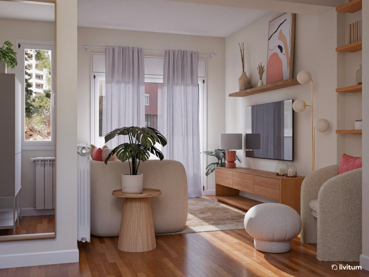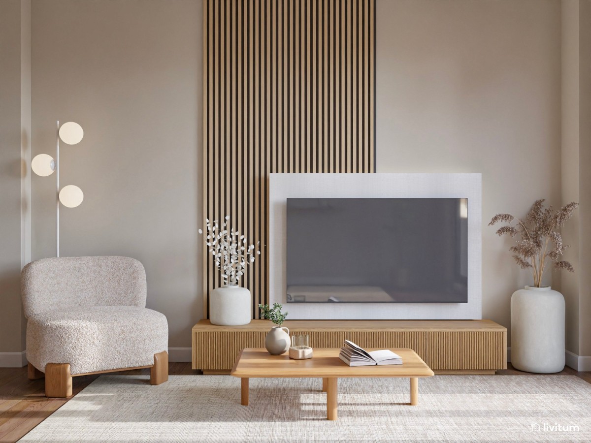 Por último, veremos que la presencia de listones de madera se refuerza en 2026 como recurso para dar estructura y profundidad a salones pequeños. Además de aportar textura a las paredes, esta solución arquitectónica ayuda a ordenar visualmente el espacio, algo clave en entornos de pocos metros cuadrados.