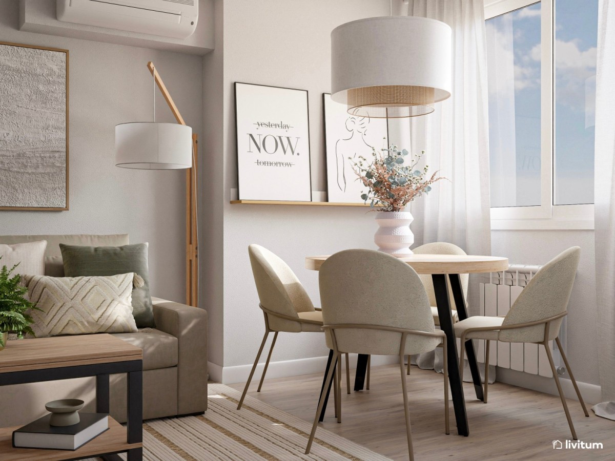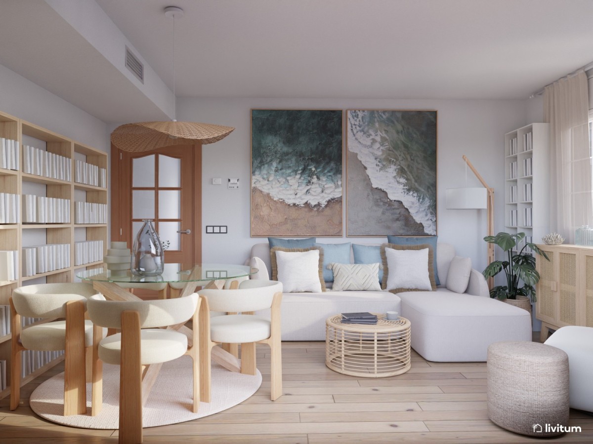 Por último, tenemos este precioso salón comedor de 14 m² donde predominan la inspiración marina y los tonos suaves. Los detalles elegantes y las líneas curvas de los muebles crean una estancia fluida y aireada, ideal para crear esa amplitud visual que requieren los espacios pequeños.