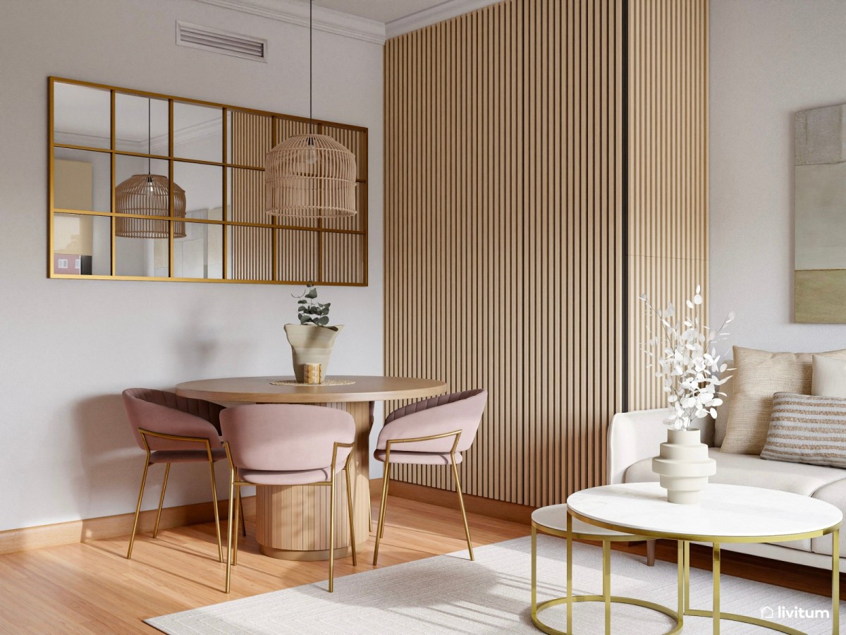 Nos encanta la mesa redonda del comedor, que combina muy bien con ese precioso conjunto de sillas en rosa palo. Los detalles en dorado y algunas plantas ornamentales tampoco pueden faltar.