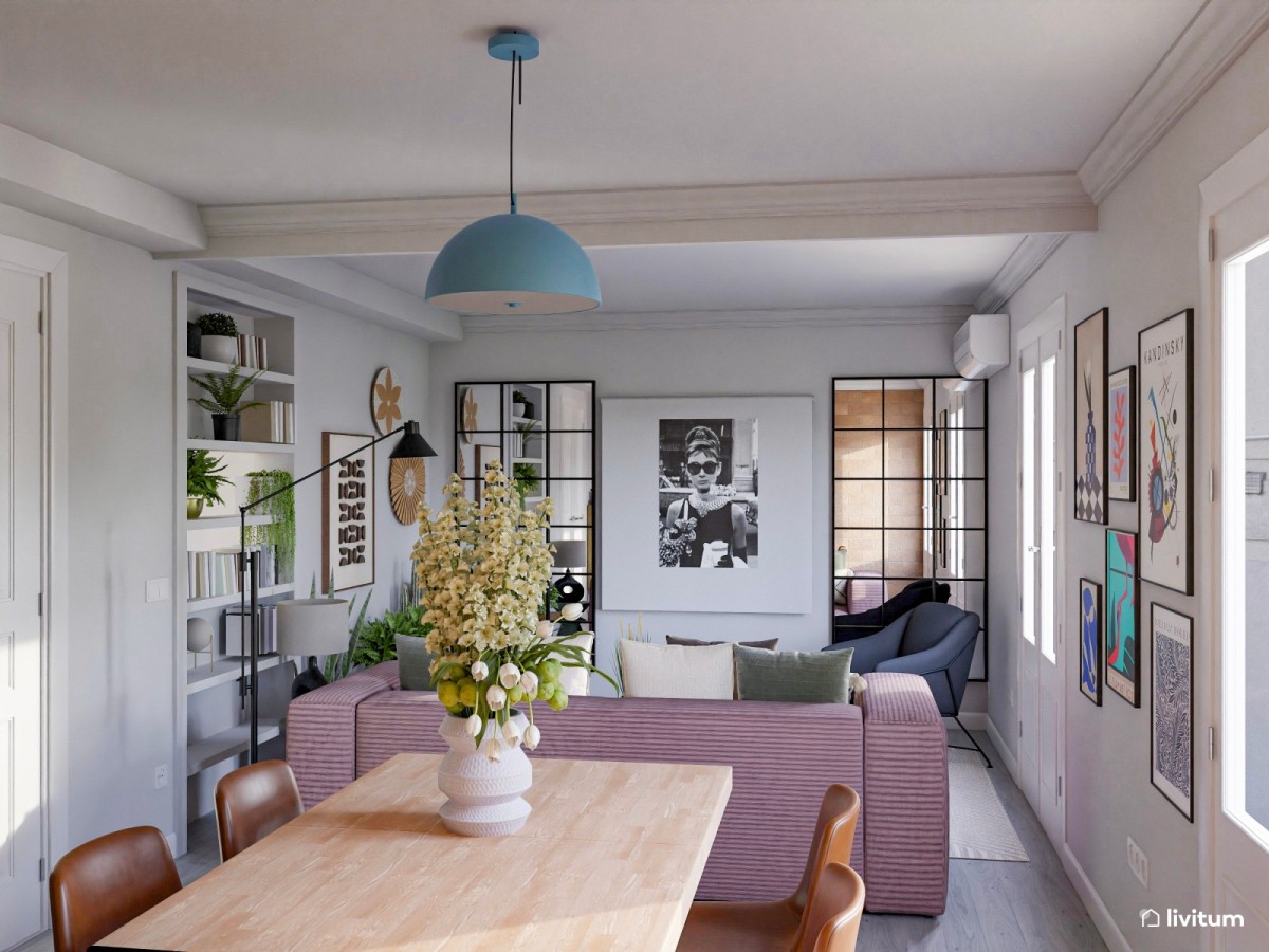 En esta estancia diseñada por Laura Álvarez no hay miedo a la creatividad. La experta ha conseguido una estética llamativa y colorida en tan solo 19 m² . Llama la atención el bello sofá de color malva que contrasta con tonos azules, verdes y crema.