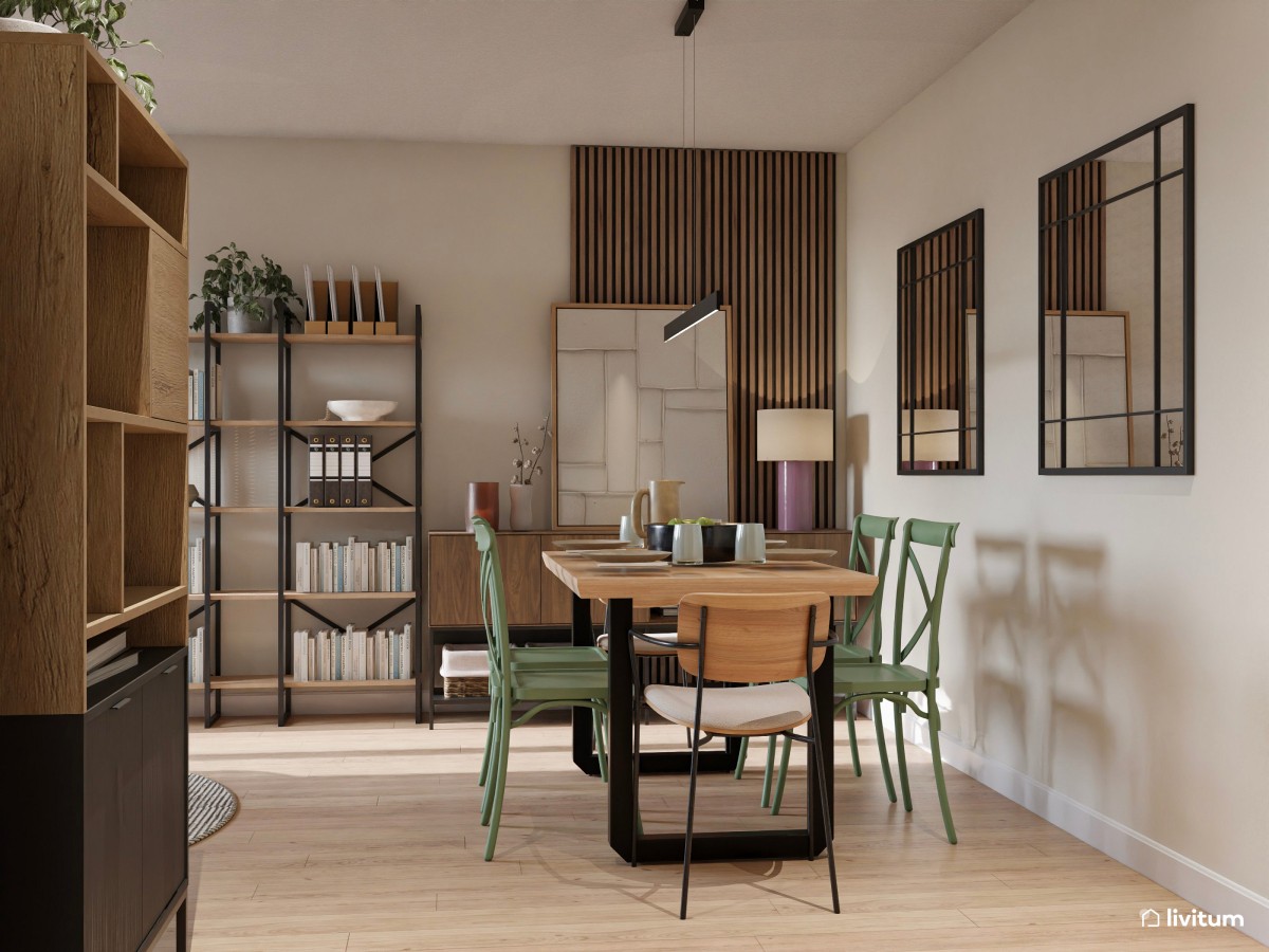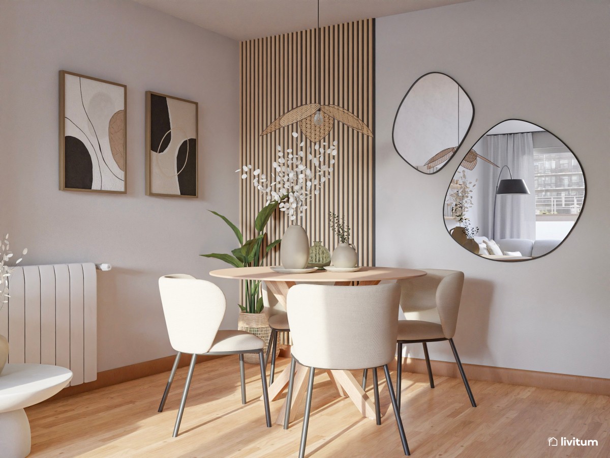 Puedes delimitar la zona del comedor con unos listones de madera decorando la pared, separándolo así visualmente de otras zonas de la casa que compartan el mismo espacio.