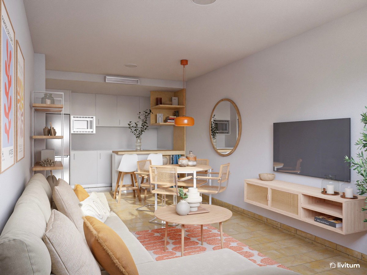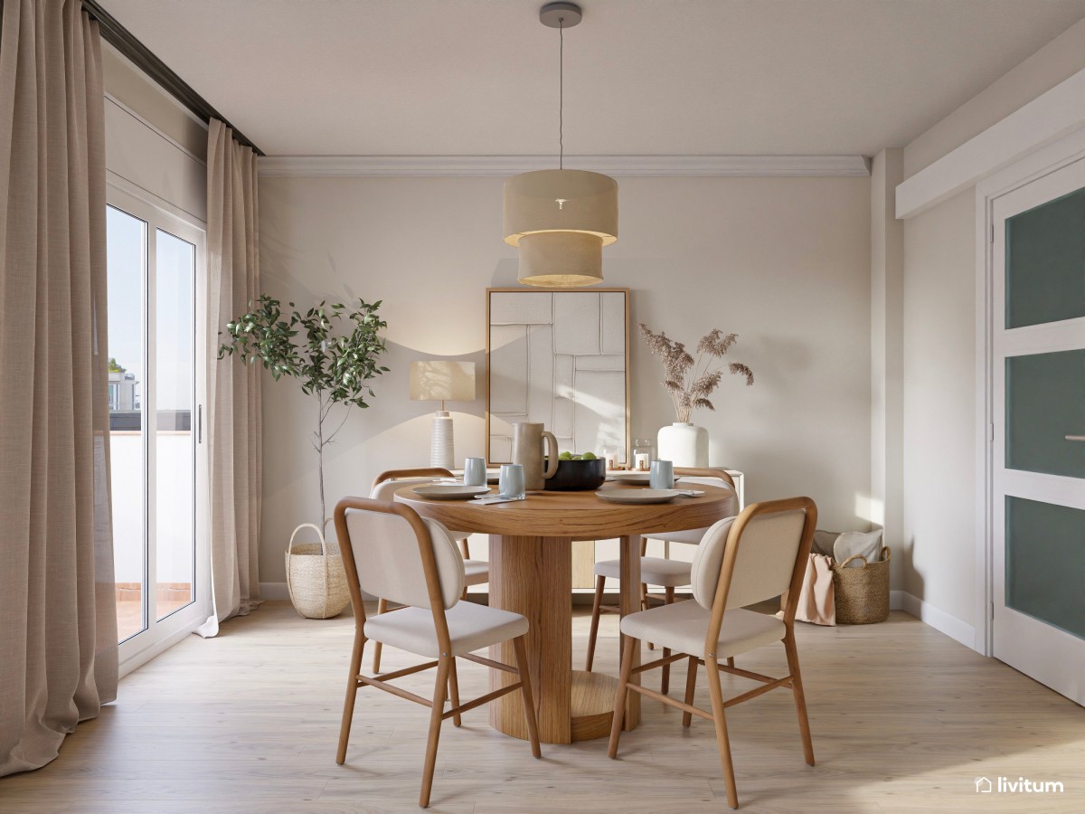 Aunque se trata de un espacio de pocos metros cuadrados, hay algunos turquillos que puedes usar para maximizar visualmente su espacio, elijas el estilo que elijas. Desde usar una paleta de colores clara que aporte luminosidad y, por tanto, mayor amplitud, a muebles de líneas sencillas, mesas circulares que ocupan menos espacio o sillas sin reposabrazos que no ocupen demasiado. Después solo tendrás que añadir algunos complementos que eleven el diseño y podrás conseguir un estiloso comedor, como algunos de estos 16 comedores pequeños de clientes de Livitum.