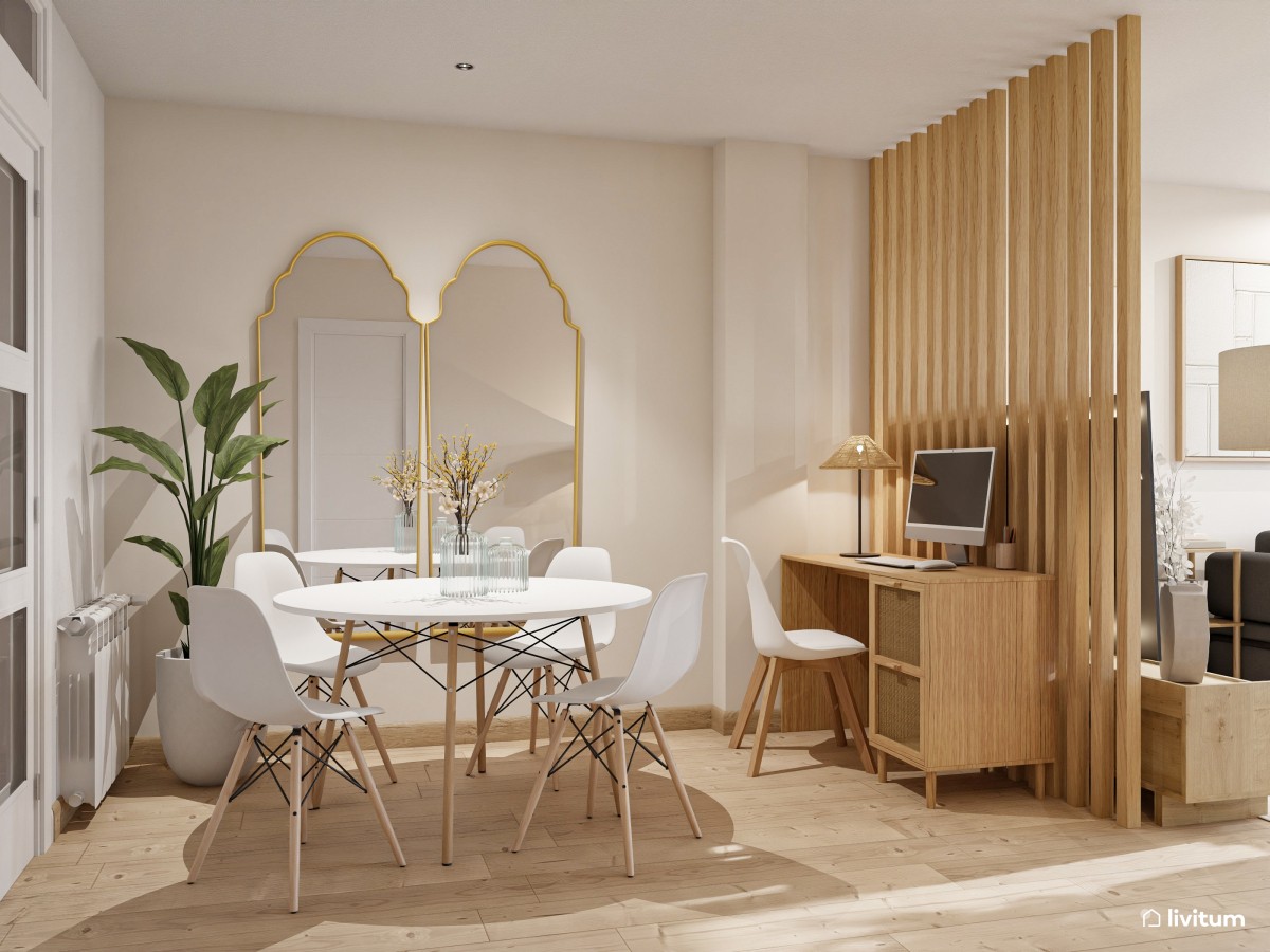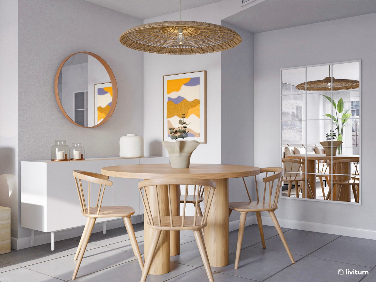 Simple, no quiere decir que comedor no pueda ser estiloso. Puedes incorporar algún elemento que eleve su sofisticación, como algún detalle dorado, a través del marco de un par de espejos de gran tamaño que, además, pueden ayudarte a agrandar visualmente un espacio de pocos metros cuadrados.