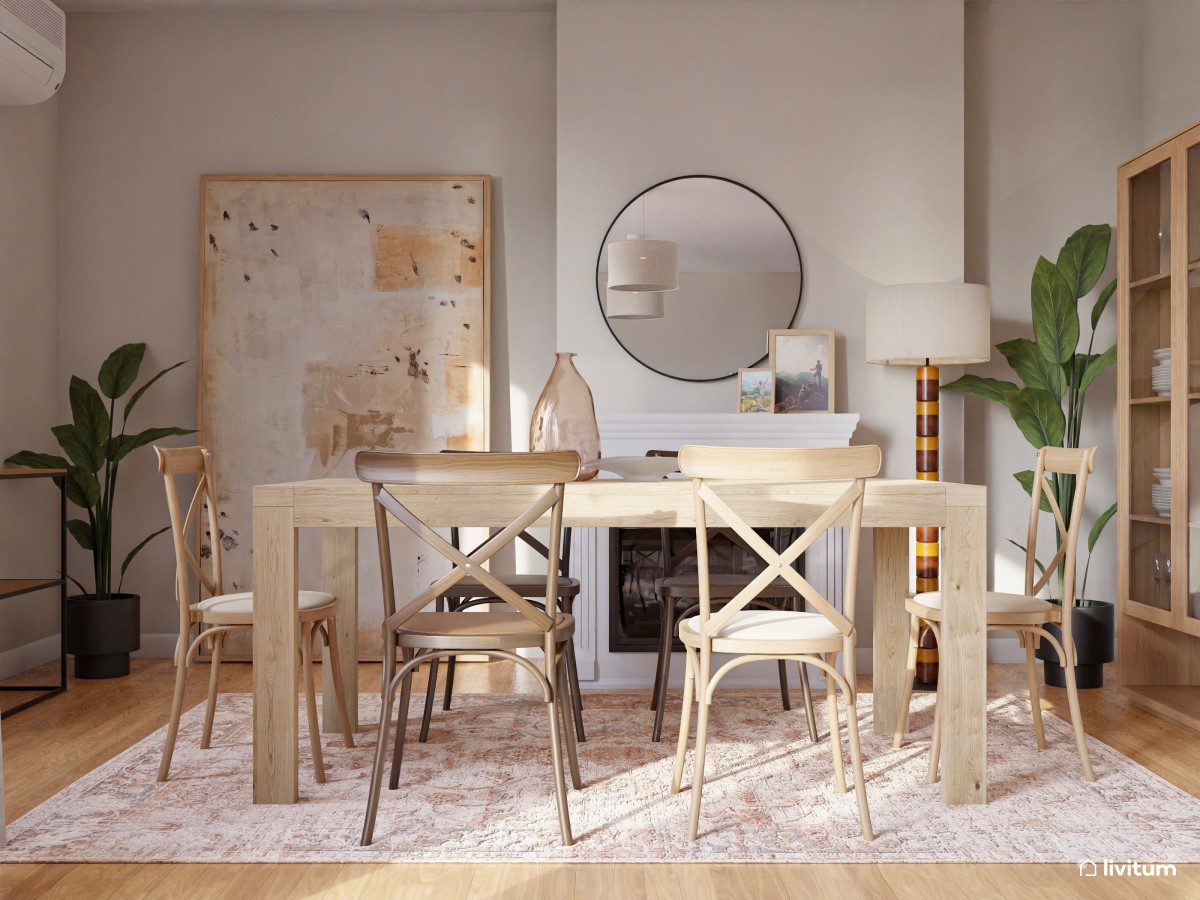 Si cuentas con una chimenea te ayudará a conseguir ese estilo rústico deseado más fácilmente. No hay nada más hogareño que un buen fuego. Así que aprovéchala y convierte tu comedor en ese espacio en el que agasajar a tus invitados con una exquisita comida y una larga sobremesa. Apuesta por una mesa de madera maciza y acompáñala de sillas del mismo material. No olvides añadir alguna planta, y sobre todo, alguna alacena o vitrina donde mostrar tu vajilla.