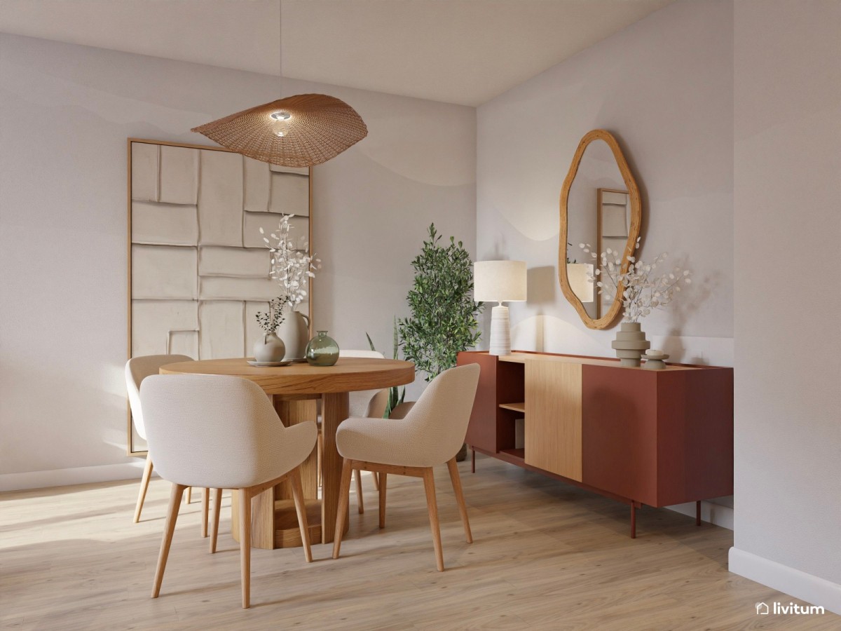 Su composición no puede ser más sencilla y efectiva. Una mesa circular, que ocupa menos espacio, con unas sillas sencillas y un aparador de madera como almacenaje. No olvides añadir alguna planta y algún detalle con carácter, como un original colgante de fibras naturales.