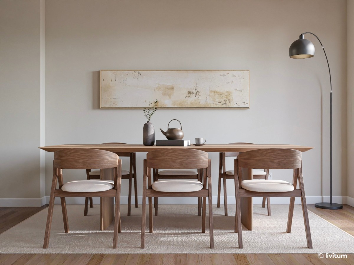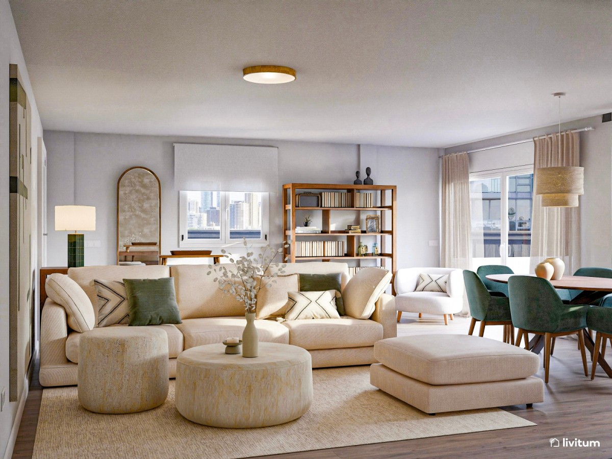Como muebles se han elegido unas originales mesas de centro, así como un aparador y una mesa de comedor con las patas de madera. Y para elevar un poco la personalidad del espacio se han añadido toques en negro, a través de la lámpara situada sobre la mesa del comedor y de las patas de las sillas de comedor.