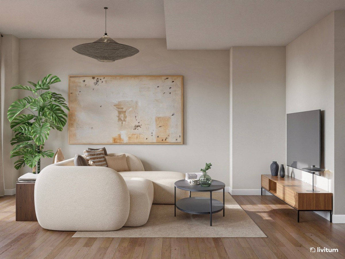 La combinación gris + beige es la elegida para este salón comedor. Un combo con el que se ha conseguido crear un ambiente muy relajado, a la par que elegante.