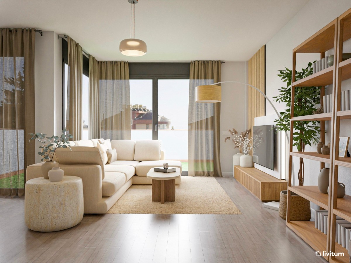 En la parte trasera del sofá se ha creado un rincón de lectura con una cómoda butaca, también en beige, y una espectacular estantería abierta de madera, que aporta mucho almacenaje y, de paso, añade calidez.