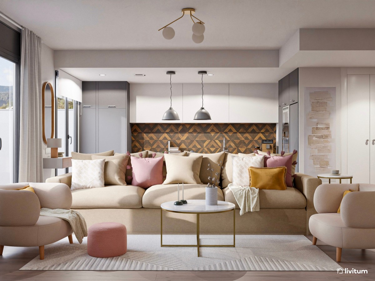 13. Añadir colores de acento marcará la diferencia entre una decoración normal y una de revista. Algo tan sencillo como unos cojines de colores llamativos, replicados en un puff tapizado, por ejemplo, elevan el diseño y alegran la estancia.