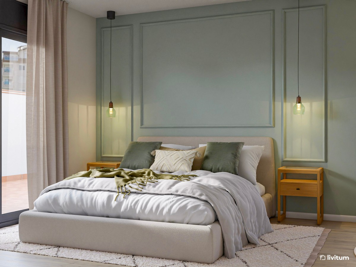 5. ¿Quieres un dormitorio elegante? Ficha esta sencilla propuesta en la que pared principal se ha pintado de un elegante color verde, a la que tan solo se le han añadido molduras para elevar su diseño.