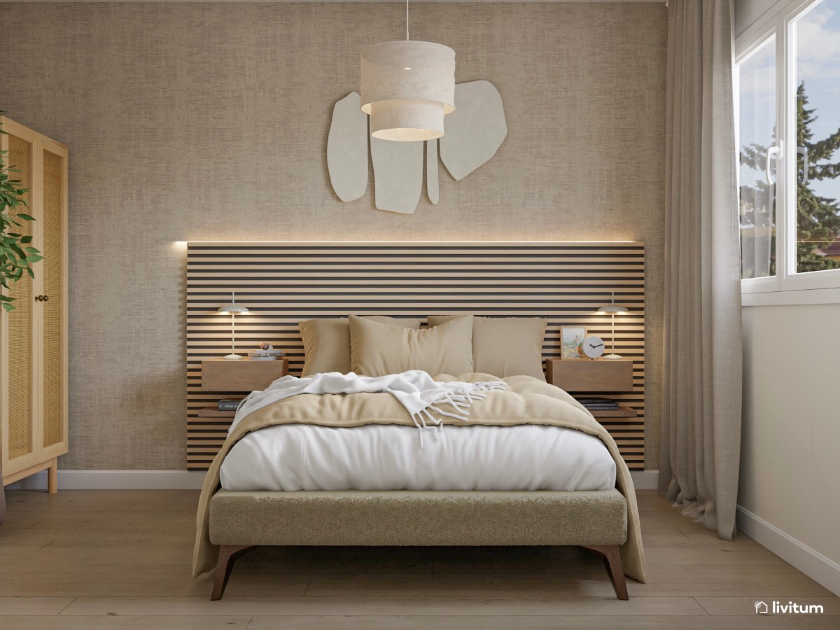 16. Elegante dormitorio de tonos tierras donde la pieza más destacada es un cabecero de listones de madera puestos en horizontal, lo cual le da amplitud al espacio, al igual que las mesillas de noche colgadas, sin tocar el suelo. Otro detalle, el armario ropero con las puertas de ratán.