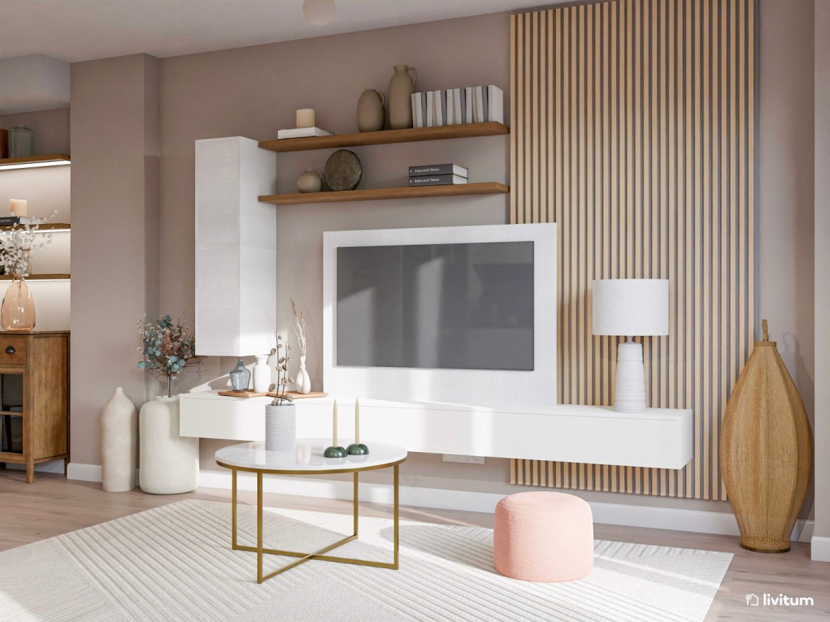 18. Una combinación muy efectiva, que es fácil copiar: listones de madera en la pared del televisor, con muebles blancos. Después solo se han de añadir detalles interesantes que eleven el diseño, como unas baldas de madera, para cohesionar la decoración, o una espectacular mesa de centro circular de mármol con las patas en dorado.
