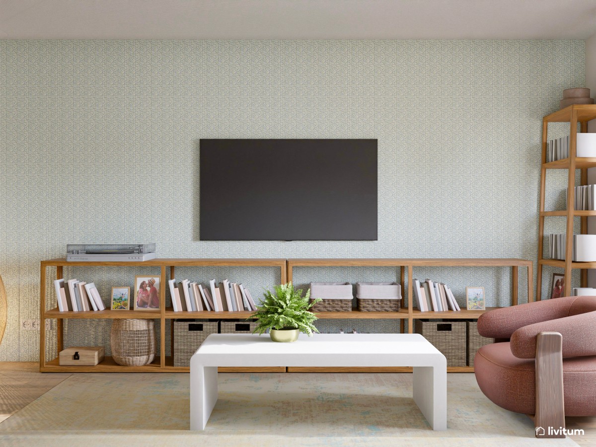 15. Simple y sencillo. Así es este salón en el que un par de estanterías abiertas de madera, una de ellas situada bajo el televisor, y la otra en la pared lateral, son suficientes para tener almacenaje y decorar. ¿El truco para darle algo de carácter? Añadir un papel pintado con textura en la pared principal.