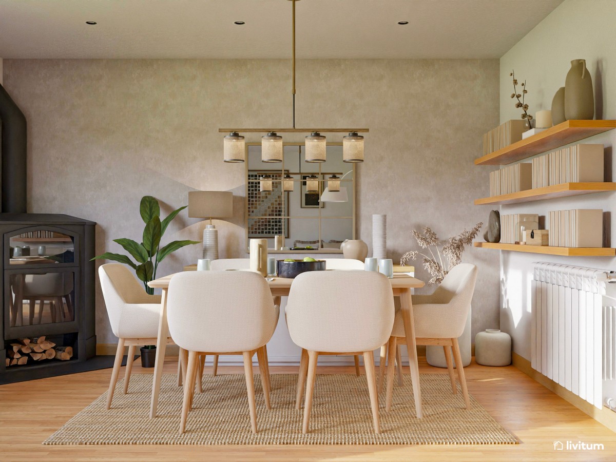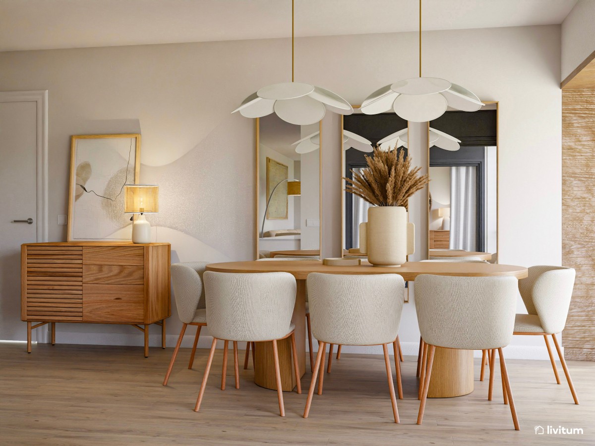 12. A veces, lo más sencillo es lo más efectivo. Como este comedor con la mesa de madera en tono claro, acompañado de unas sillas tapizadas en color crema y con un aparador blanco con el sobre de madera.