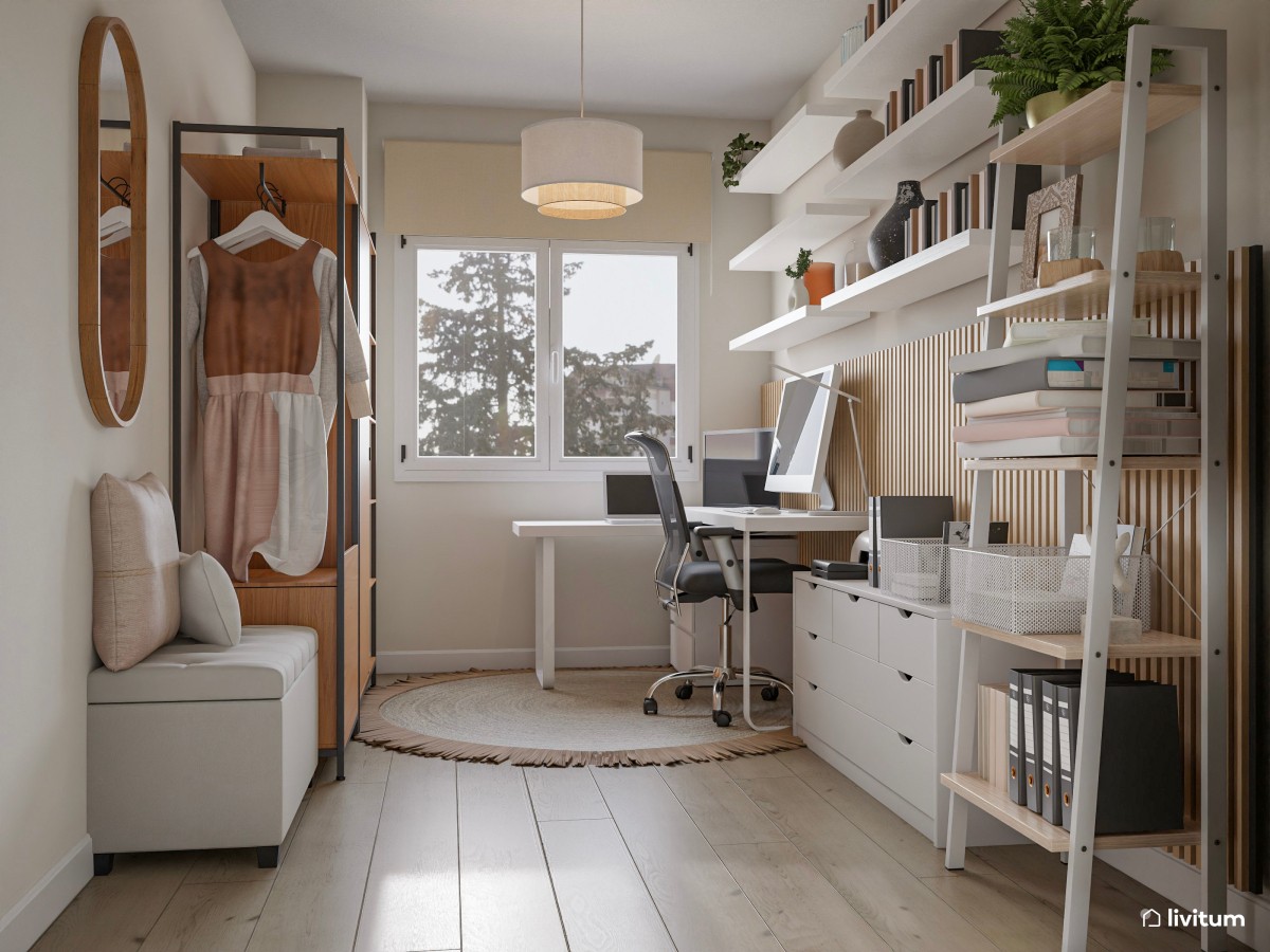 8. Una zona de trabajo necesita aprovechar al máximo la luz natural, por ello es importante que sea un lugar claro y luminoso. ¿Cómo conseguirlo? Usando tonos claros, como el blanco en paredes y muebles, e incorporando calidez a través de unos listones de madera puestos a media altura que delimiten el espacio.