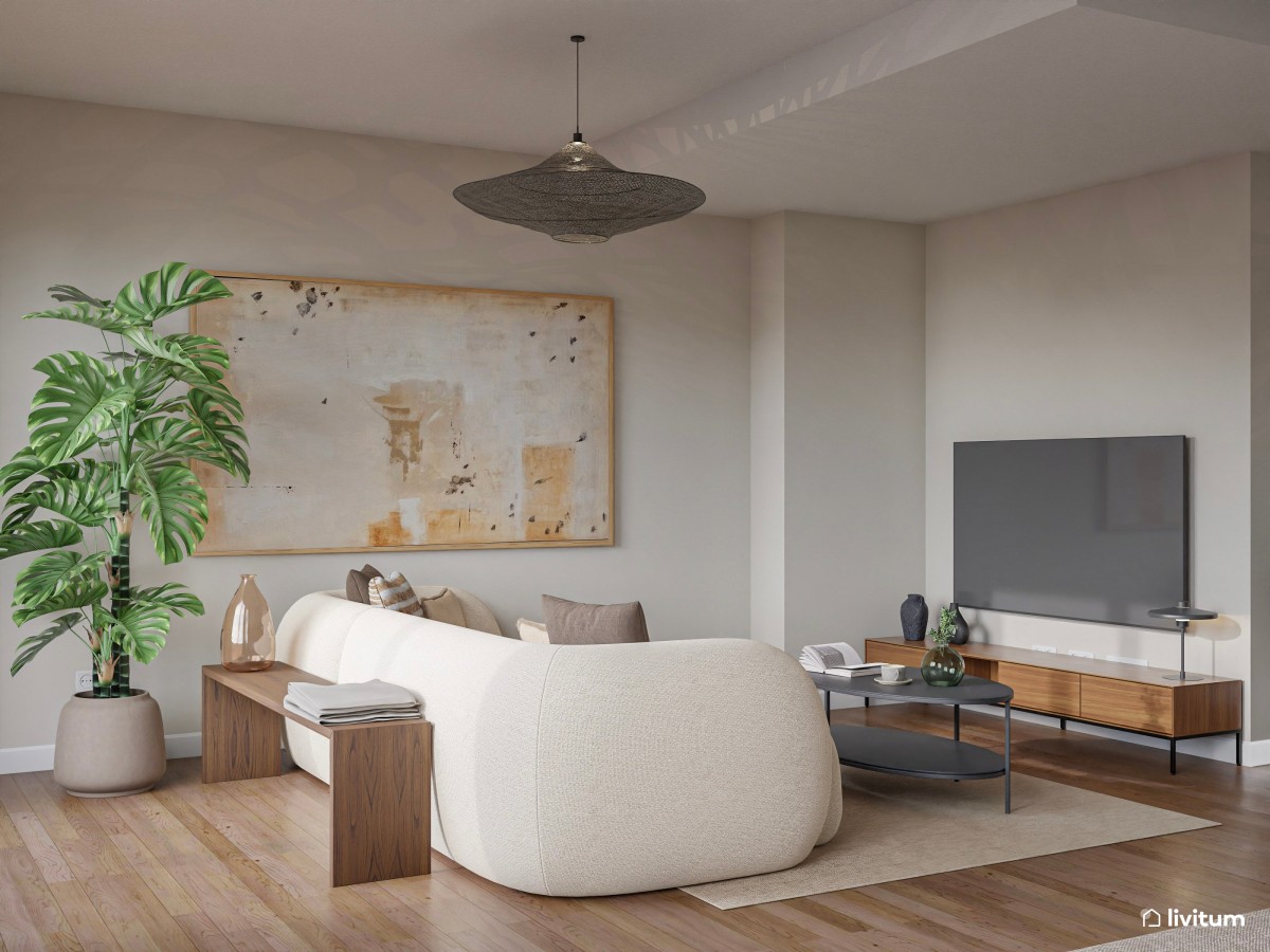 19. En ocasiones, la forma especial de un mueble es la que marca la diferencia. ¿Qué te parece este espectacular sofá? Sin duda, se lleva todas las miradas. De esta forma, el diseño no necesita mucho más. Solo una sencilla mesa de centro de metal negro, un mueble de madera bajo el televisor y, eso sí, una espectacular obra de arte de tamaño XXL.