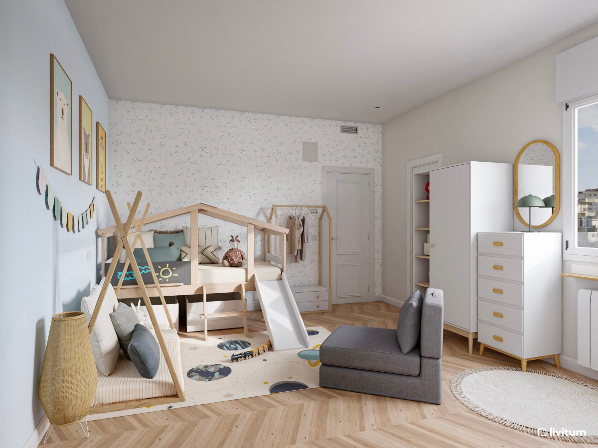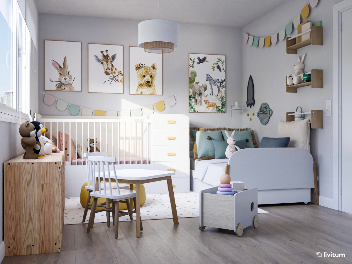 20. Las habitaciones infantiles son tan cuquis que cualquier diseño resulta coqueto. Echa un vistazo a este, en el que se combina una cama con una cuna, para albergar a niños de diferentes edades. El resto de espacio se dedica a los juegos, con una bonita alfombra y muebles de su medida.
