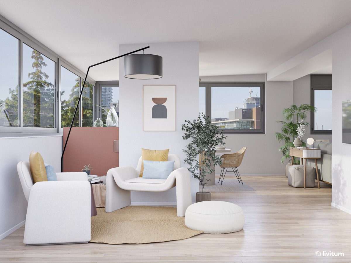 6. Crear un bonito rincón de lectura es tan sencillo como incorporar unas modernas y originales butacas, una alfombra de fibras naturales y una maravillosa lámpara de pie de arco que ilumine la zona.