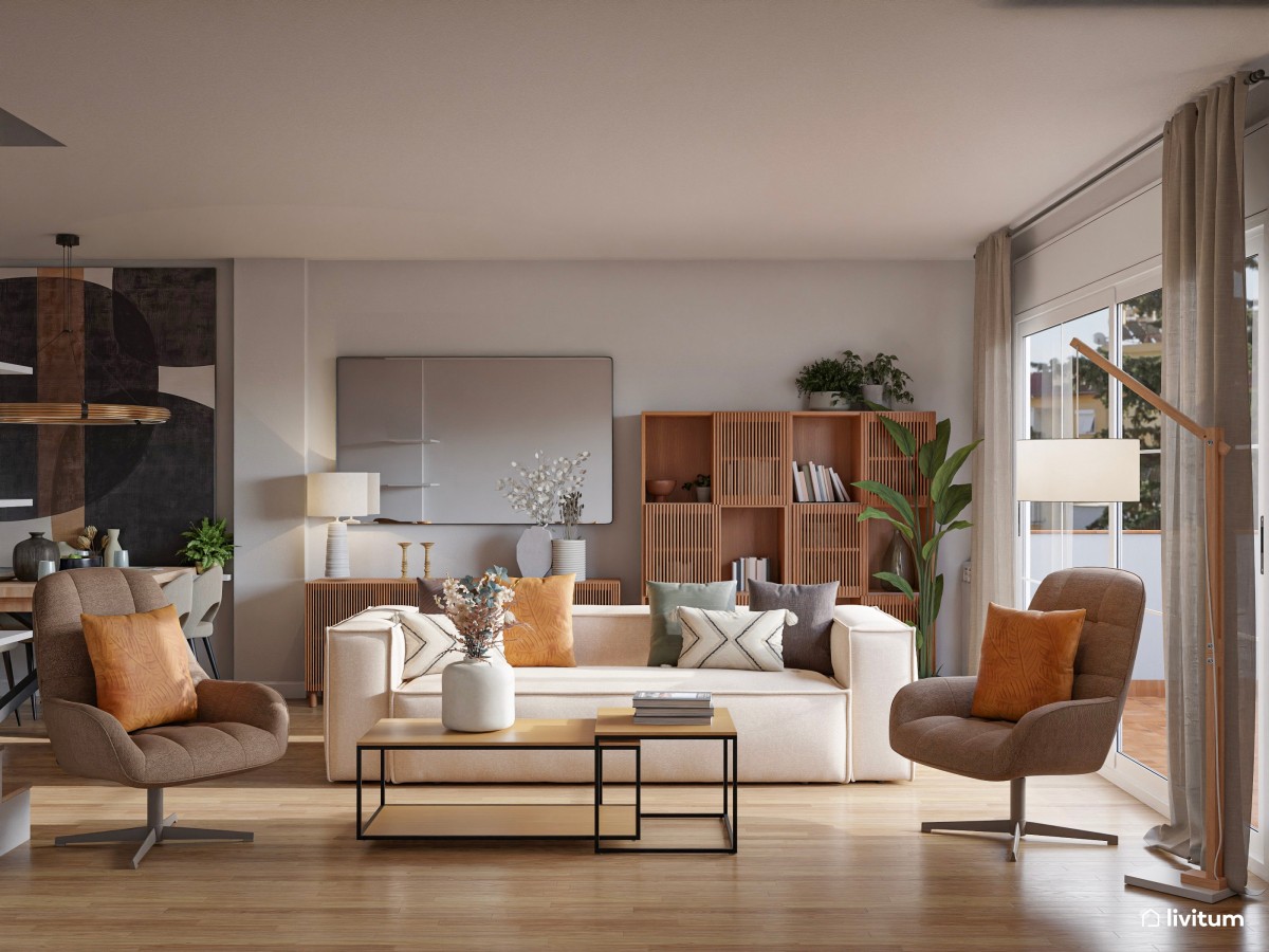 9. Los tonos tierra son tendencia, los muebles con el frente alistonado, también. Únelos en la decoración de tu salón y tendrás una combinación ganadora.