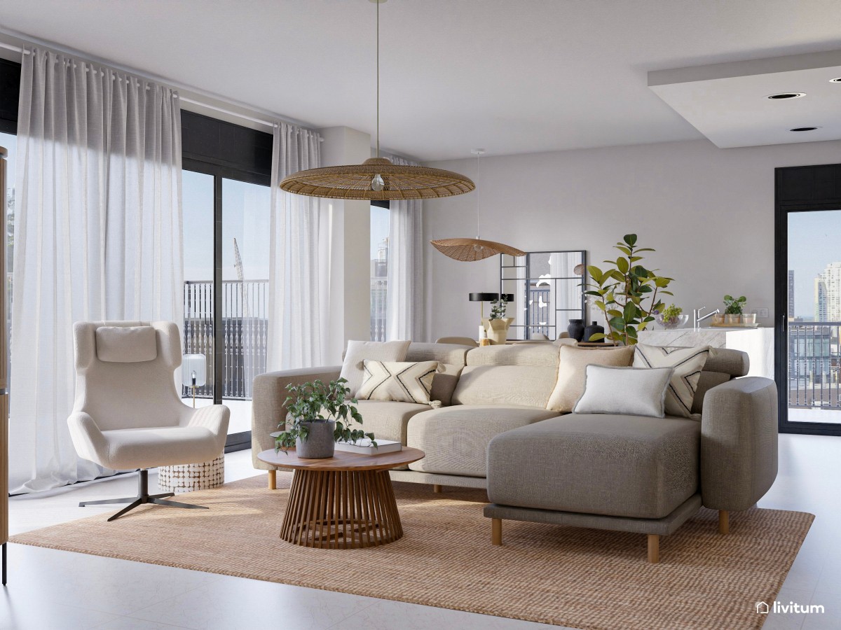 1. Como este salón nórdico en el que no faltan las características principales de este estilo: tonos neutros y claros, madera y detalles en fibras naturales, como la alfombra o dos espectaculares colgantes que son los protagonistas indiscutibles del diseño.