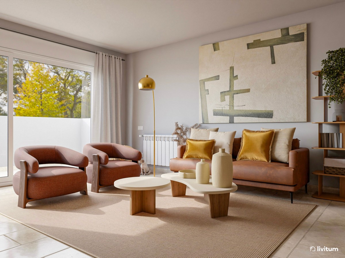 14. Sofisticado y vintage. Así es este salón en que un precioso sofá de piel cohabita con un par de originales butacas de tono terracota. El toque final lo pone una lámpara de pie en dorado y una gran obra de arte en la pared.