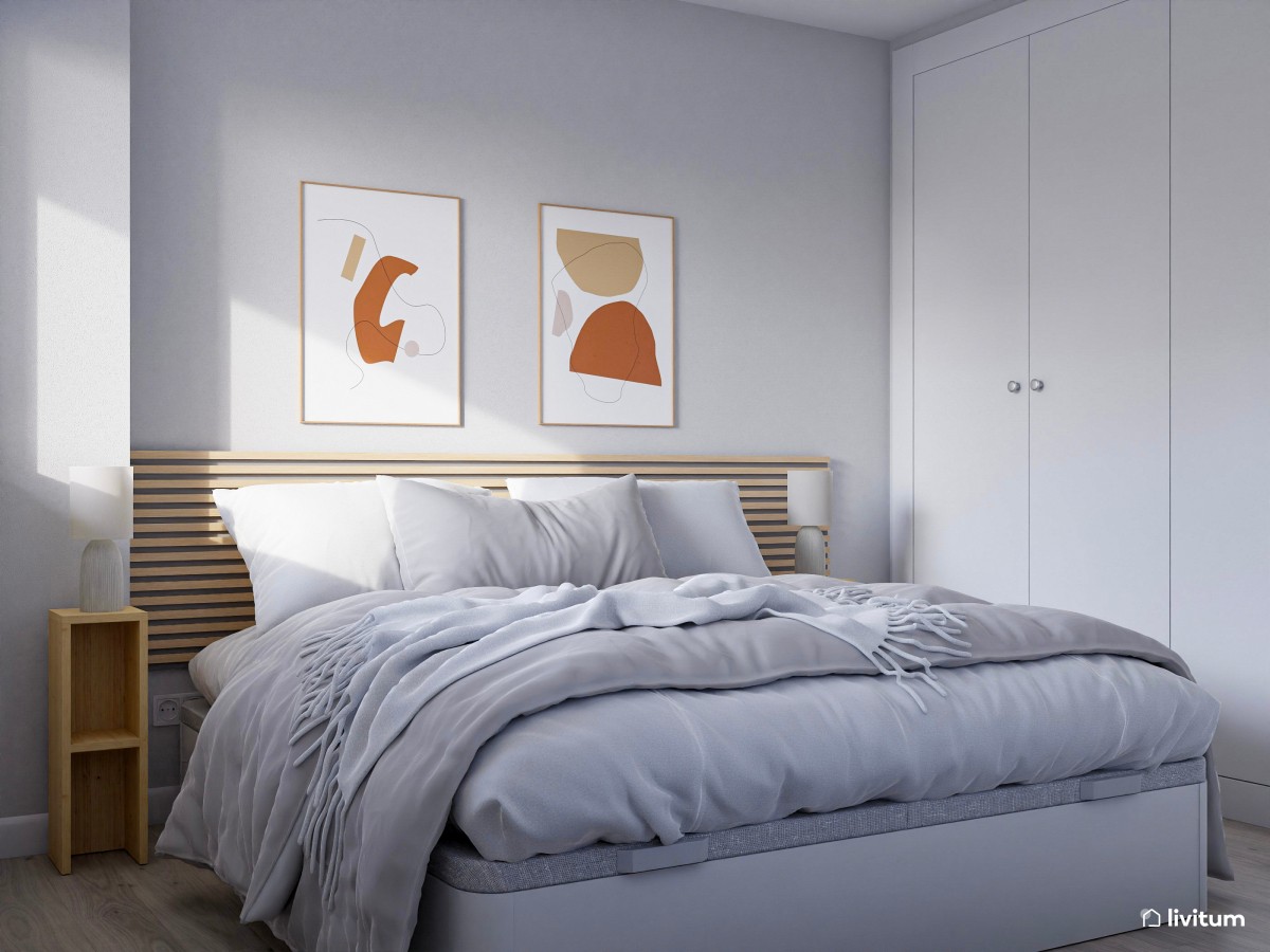 El dormitorio doble mantiene la misma filosofía del diseño general de la vivienda: un estilo moderno y sobrio. La cama, con un cabecero de paneles acústicos en horizontal, se viste en tonos beige, transmitiendo serenidad y calma visual.