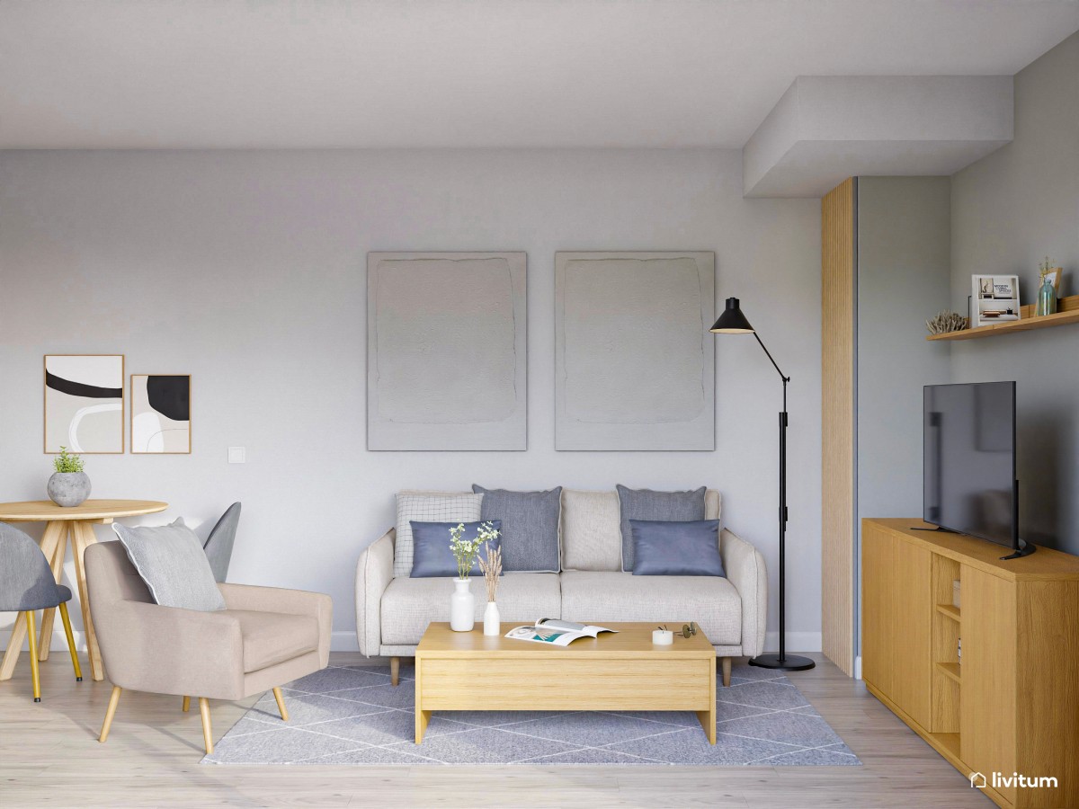 La distribución incluye un salón comedor de planta rectangular con cocina abierta. Nuestros profesionales optaron por un mobiliario moderno, de líneas simples y con una fuerte presencia de tejidos claros y maderas suaves. En el salón, optamos por un sofá de dos plazas y una elegante butaca gris. De esta manera, aprovechamos al máximo la luz natural del espacio gracias al uso de tonos claros y las texturas suaves.