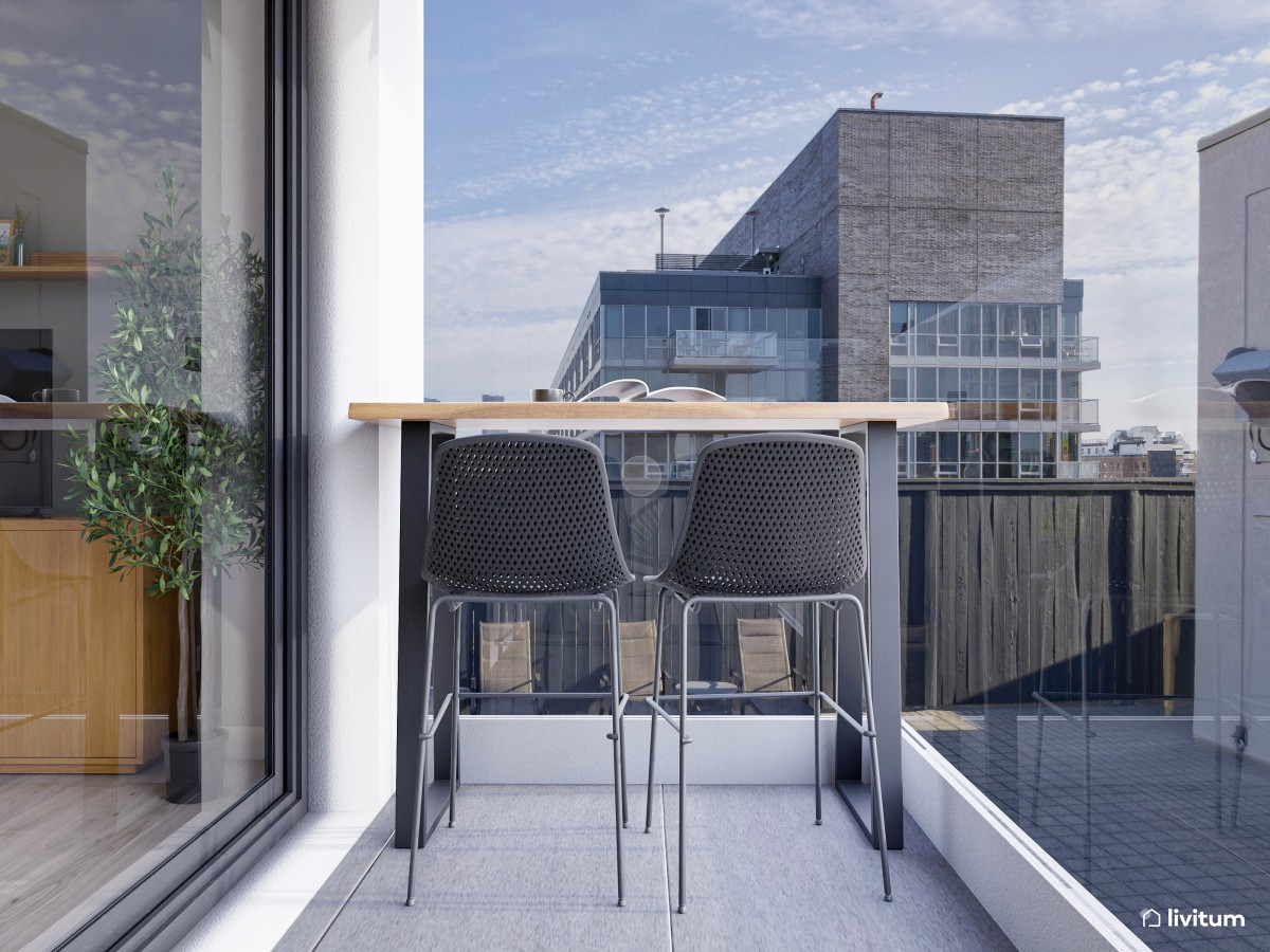 Por último, en este fantástico piso se puede disfrutar de una copa o una conversación al aire libre gracias a la terraza. En ella, escogimos una serie de piezas en tonos grises para lograr un ambiente moderno y sofisticado. Amueblamos con un taburete de varillas, una mesita auxiliar y un pequeño comedor exterior con vistas privilegiadas a la zona de Madrid Río.