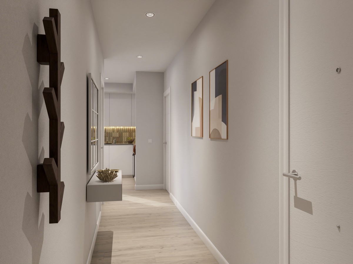 El recibidor y pasillo se han equipado con una consola flotante, un espejo cuadrado y un perchero de madera en la pared. Elementos sencillos, pero claves para dar una bienvenida y una primera impresión de lo más ordenada y elegante. Por último, para reforzar la propuesta, complementamos con dos cuadros abstractos en tonos oscuros.