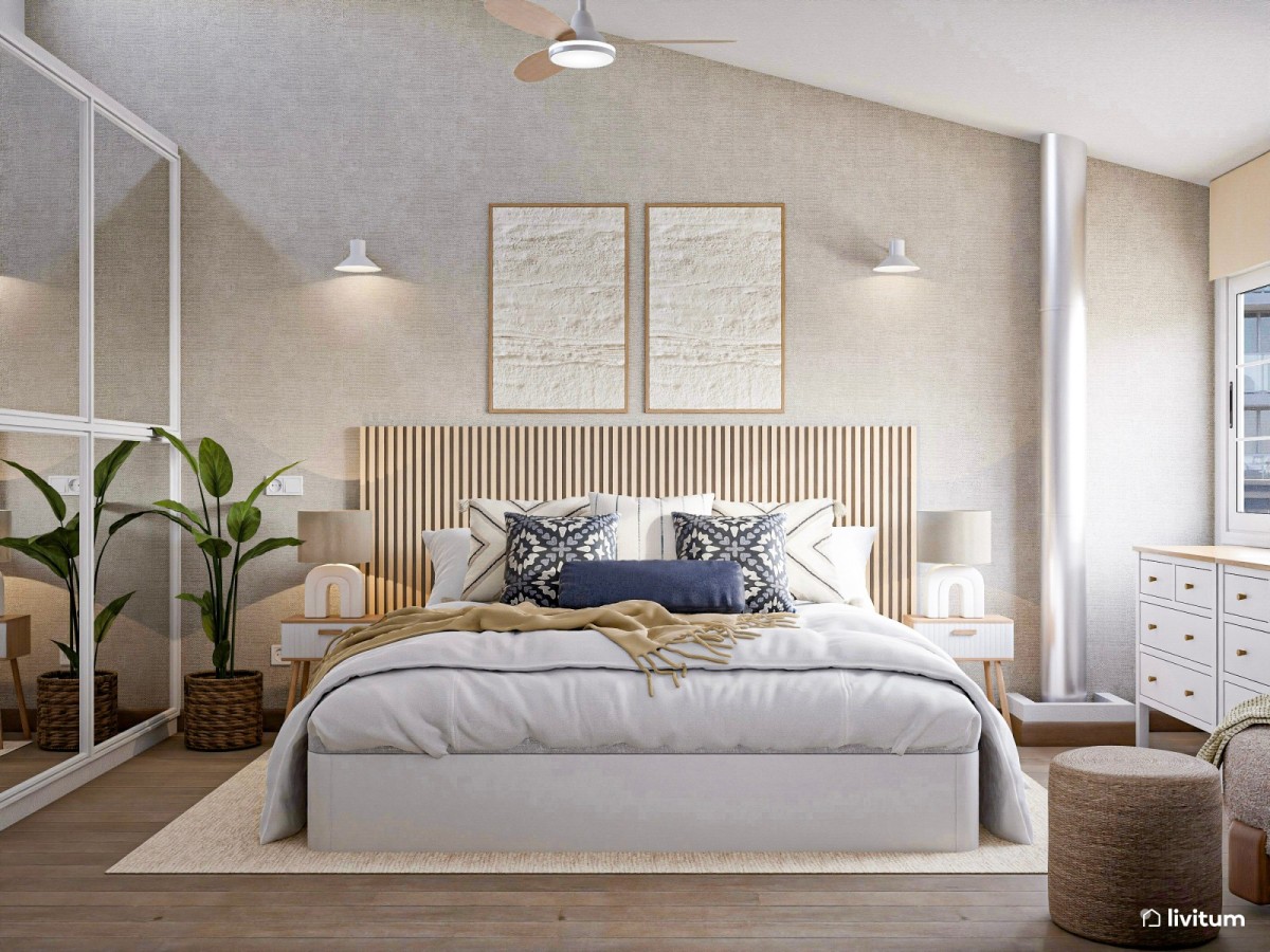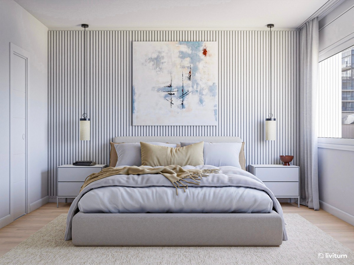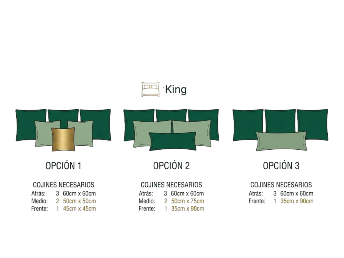 En una cama king, debemos cuidar especialmente bien las proporciones. Al haber tanto ancho disponible, una composición pequeña se queda corta. Por eso, suelen funcionar las composiciones simétricas (y bien escalonadas), con una base generosa y un remate claro.