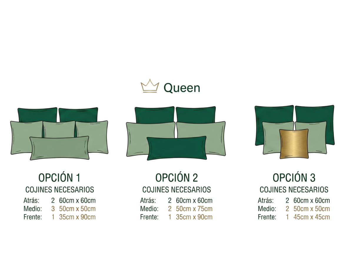 Si tienes una cama de tamaño queen, la clave está en aprovechar ese extra de anchura sin que la composición sobrecargue la decoración general del dormitorio. Una fórmula muy agradecida es colocar dos cojines cuadrados de 60 x 60 cm y, sobre ellos, tres cojines de 50 x 50 cm. Para sellar el conjunto, añade un cojín rectangular pequeño en el centro (por ejemplo, de 30 x 50 cm) que aporte el gesto final con un estampado sutil o un color más subido dentro del mismo esquema cromático.