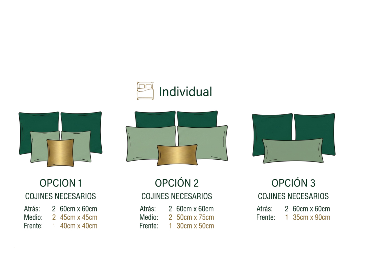 En una cama “común”, es decir, individuales o matrimoniales de tamaño normal, existen tres composiciones que nunca fallan. La primera de ellas consiste en colocar una serie de cojines cuadrados. Primero, colocarás una base de dos cojines de 60 x 60 cm. Encima, otro par de cojines de 45 x 45 cm. Y por último, puedes sellar la composición con un cojín cuadrado más pequeño, idealmente en un tono más vistoso.