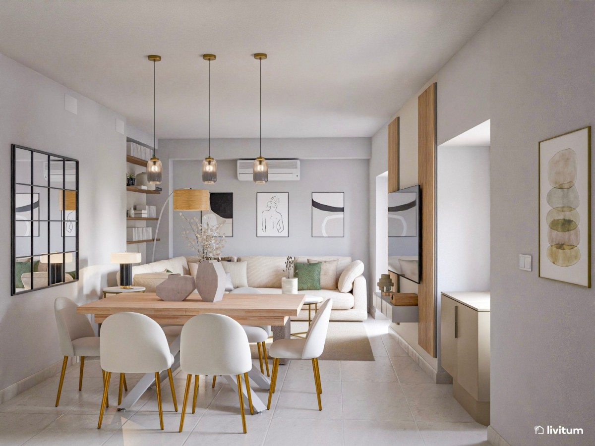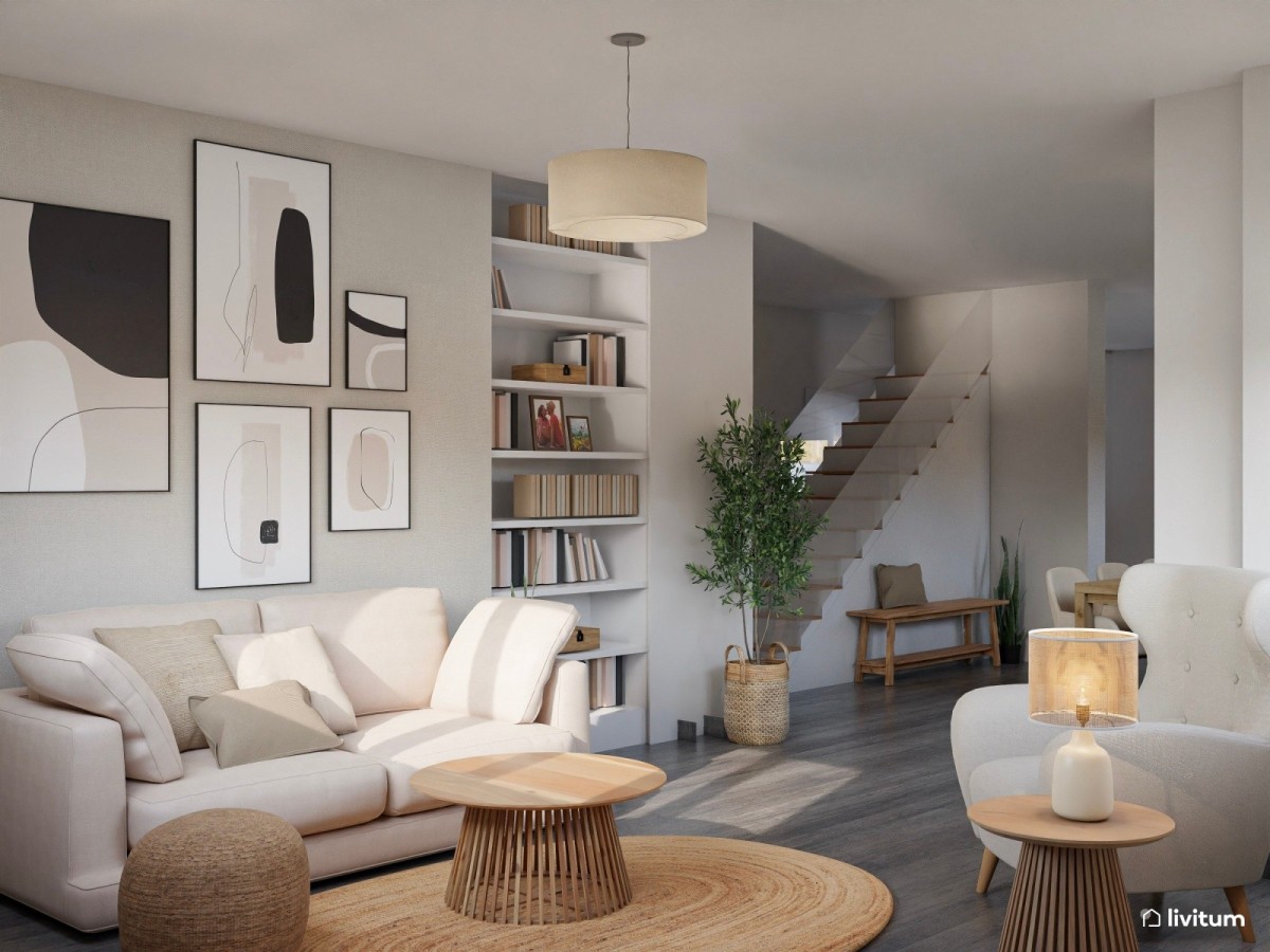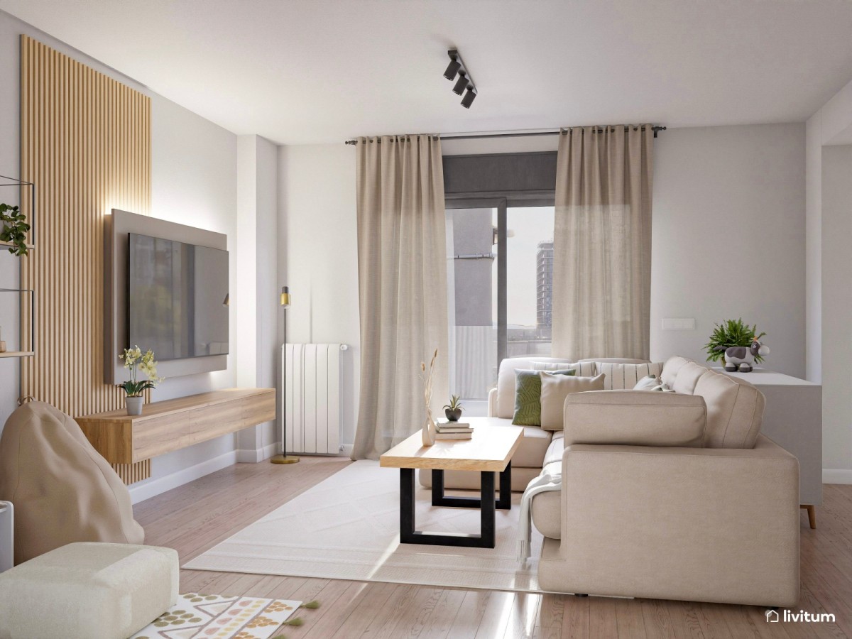 También puedes trabajar la pared con listones de madera o paneles acústicos decorativos. Ayudan a ordenar visualmente el plano vertical, aportan textura y, en muchos casos, mejoran el sonido del espacio. Funcionan muy bien detrás del sofá, en la pared del cabecero o en pasillos largos que piden algo más de calidez.
