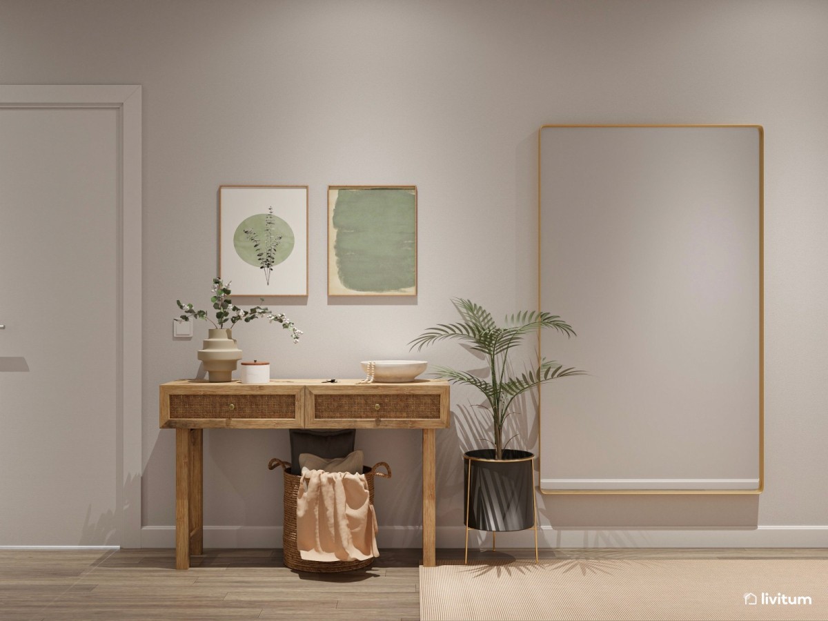Además de una adecuada paleta de colores, se ha aprovechado el espacio vertical y las paredes para colocar una consola estrecha, algunos cuadros decorativos y un completísimo zapatero de varios cajones. Acompañamos con una bonita alfombra alargada que aporta textura y calidez al espacio.